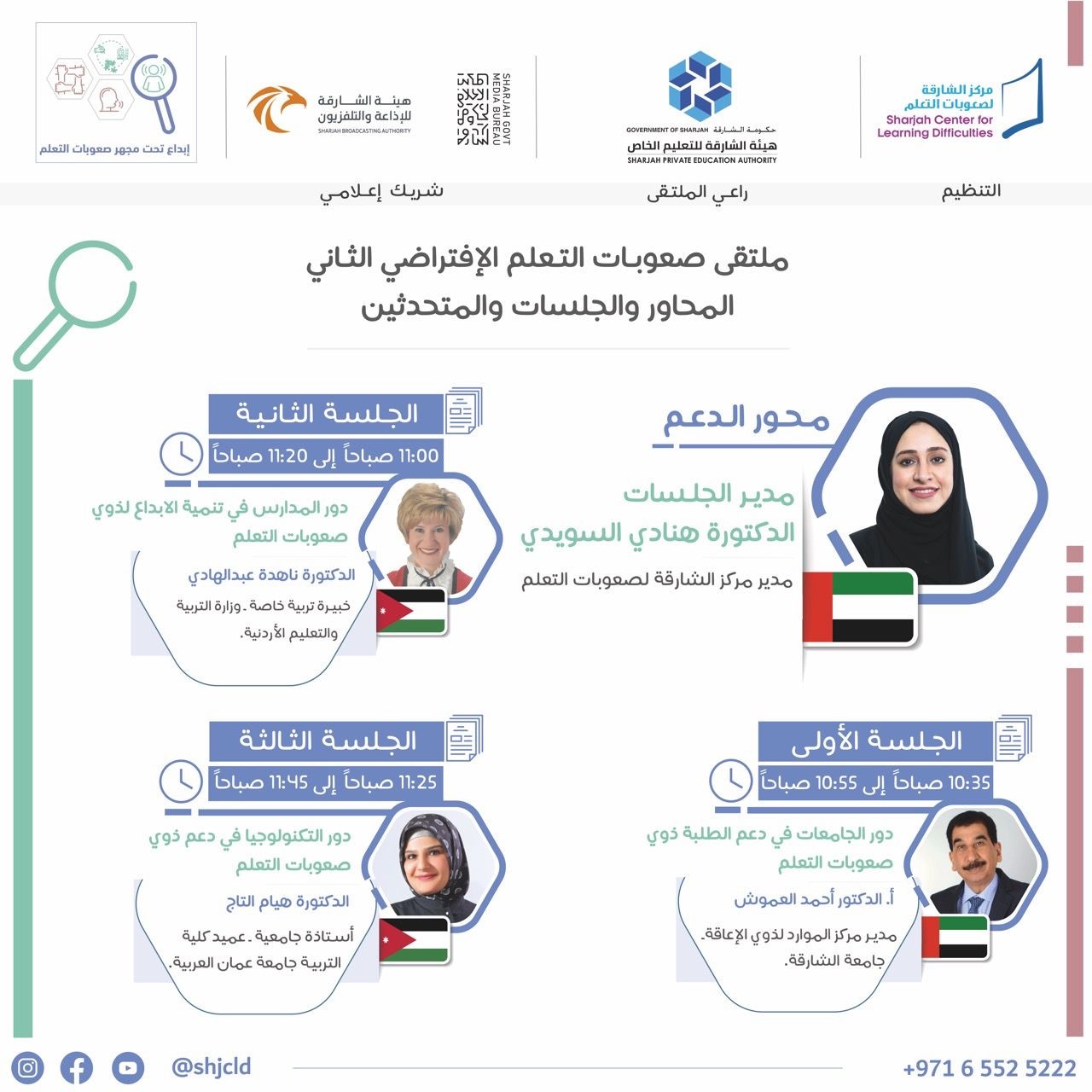 عمون - شاركت الدكتورة هيام التاج عميد كلية العلوم التربوية والنفسية في جامعة عمان العربية في فعاليات ملتقى صعوبات التعلم الافتراضي الثاني والذي عقده مركز الشارقة لصعوبات التعلم في دولة الامارات العربية المتحدة بتاريخ 28 أكتوبر والذي حمل شعار (إبداع تحت مجهر صعوبات التعلم) وتضمن أربعة محاور رئيسة تمثلت بـ (الدعم، التوعية، الإبداع، المناصرة) حيث شاركت الدكتورة هيام مع مجموعة من المختصين بالدول العربية بورقة علمية تحت عنوان "دور التكنولوجيا المساندة في دعم ذوي صعوبات التعلم" وقد تخلل الملتقى مناقشات وإجابات على أسئلة الحضور وقد تميز الملتقى بعرض قصص نجاح لذوي صعوبات التعلم وأولياء أمورهم. |