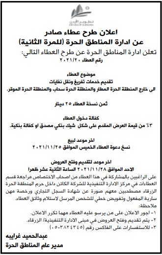 عطاء صادر عن ادارة المناطق الحرة