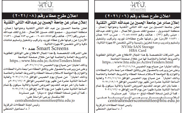 عطاء صادر عن جامعة الحسين بن عبدالله الثاني التقنية