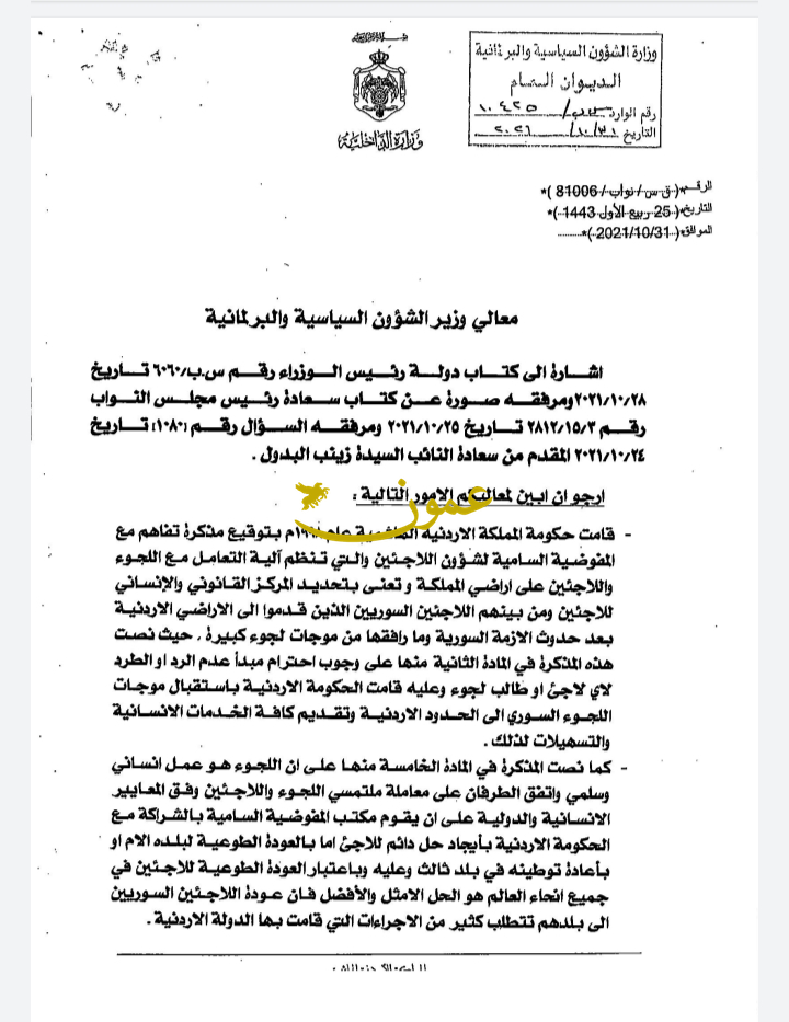 وقال الفراية ردا على اسئلة نيابية وجهتها النائب زينب البدول حول اللاجئين السوريين المقيمين في المخيمات، إنه تم فتح مركز حدود جابر أمام عودة اللاجئين بتاريخ 15-10-2018 لتسهيل عودة اللاجئين المتواجدين على أراضي المملكة طوعيا، سواء كانوا داخل المخيمات او خارجها.