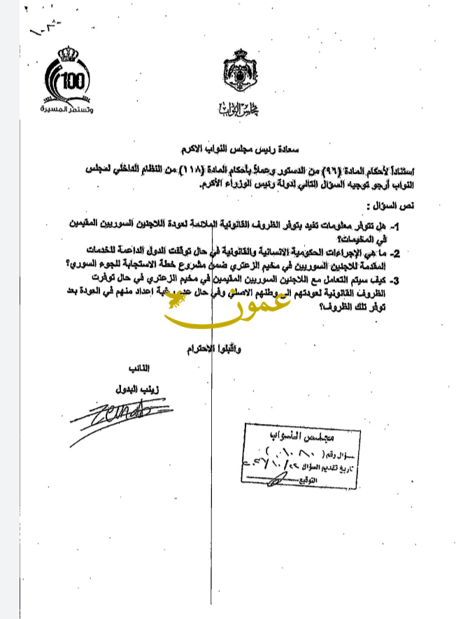 وكانت وجهت البدول أسئلة عديدة لوزارة الداخلية تعلقت بالأوضاع القانونية والإنسانية للاجئين السوريين في مخيم الزعتري، عقب تصريحات أدلى بها وزير الداخلية مؤخرا حول القضية.