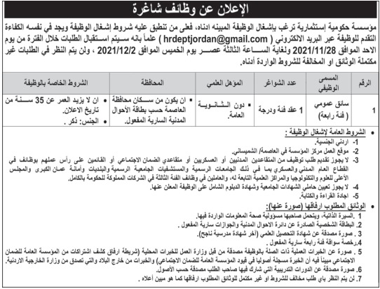 مطلوب سائق عمومي للعمل لدى مؤسسة حكومية استثمارية
