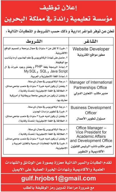 مؤسسة تعليمية رائدة في البحرين ترغب بتعيين إداريين