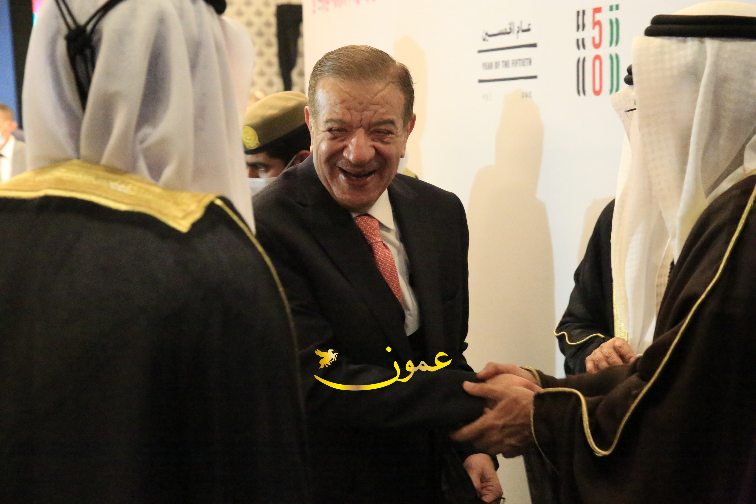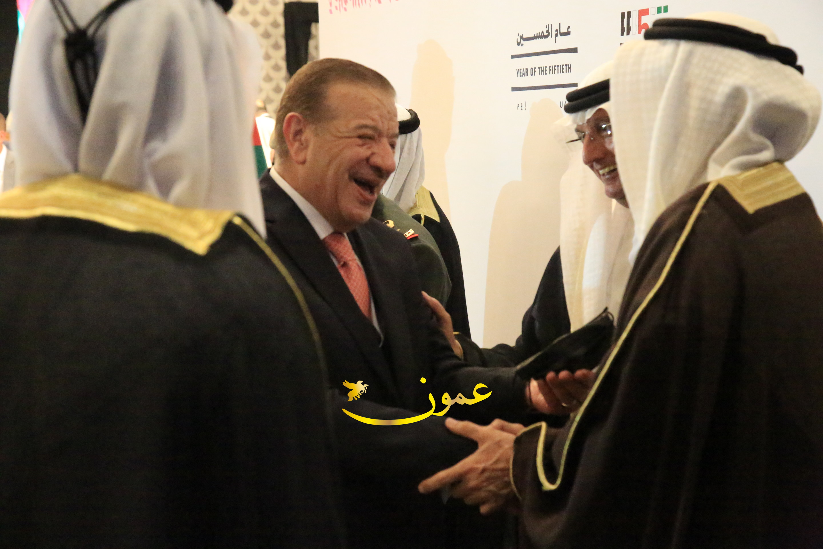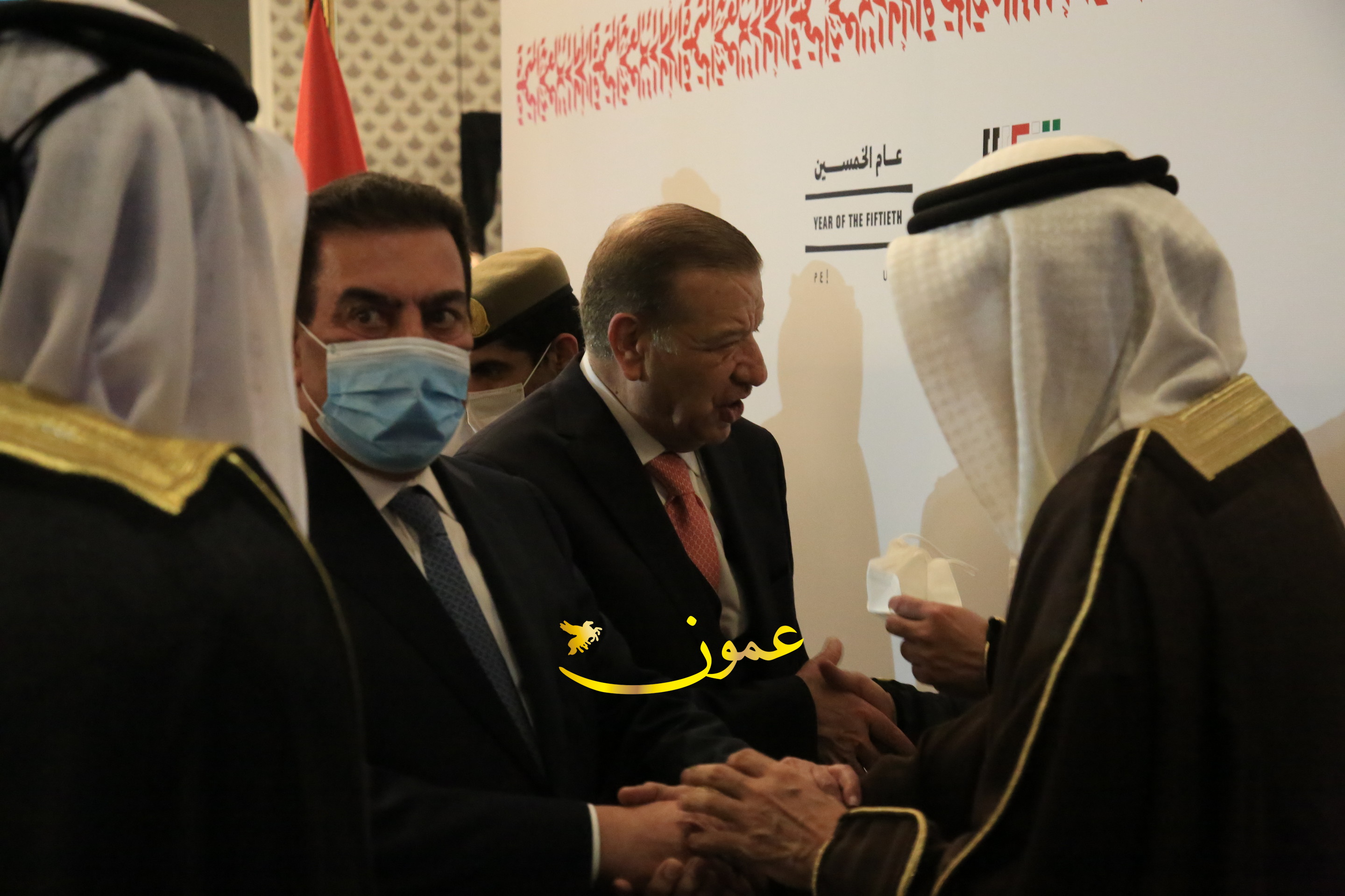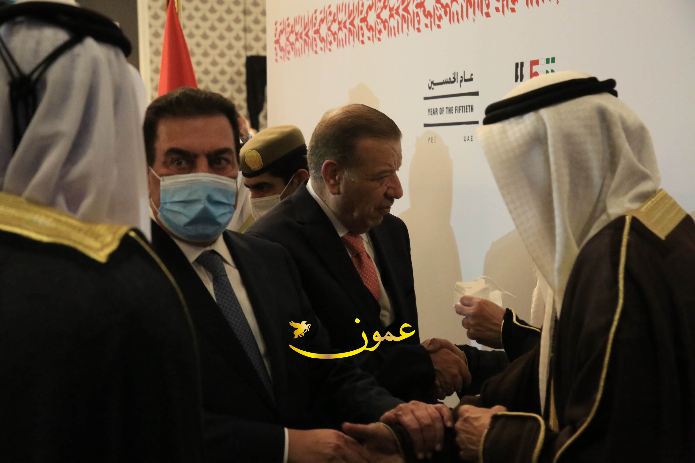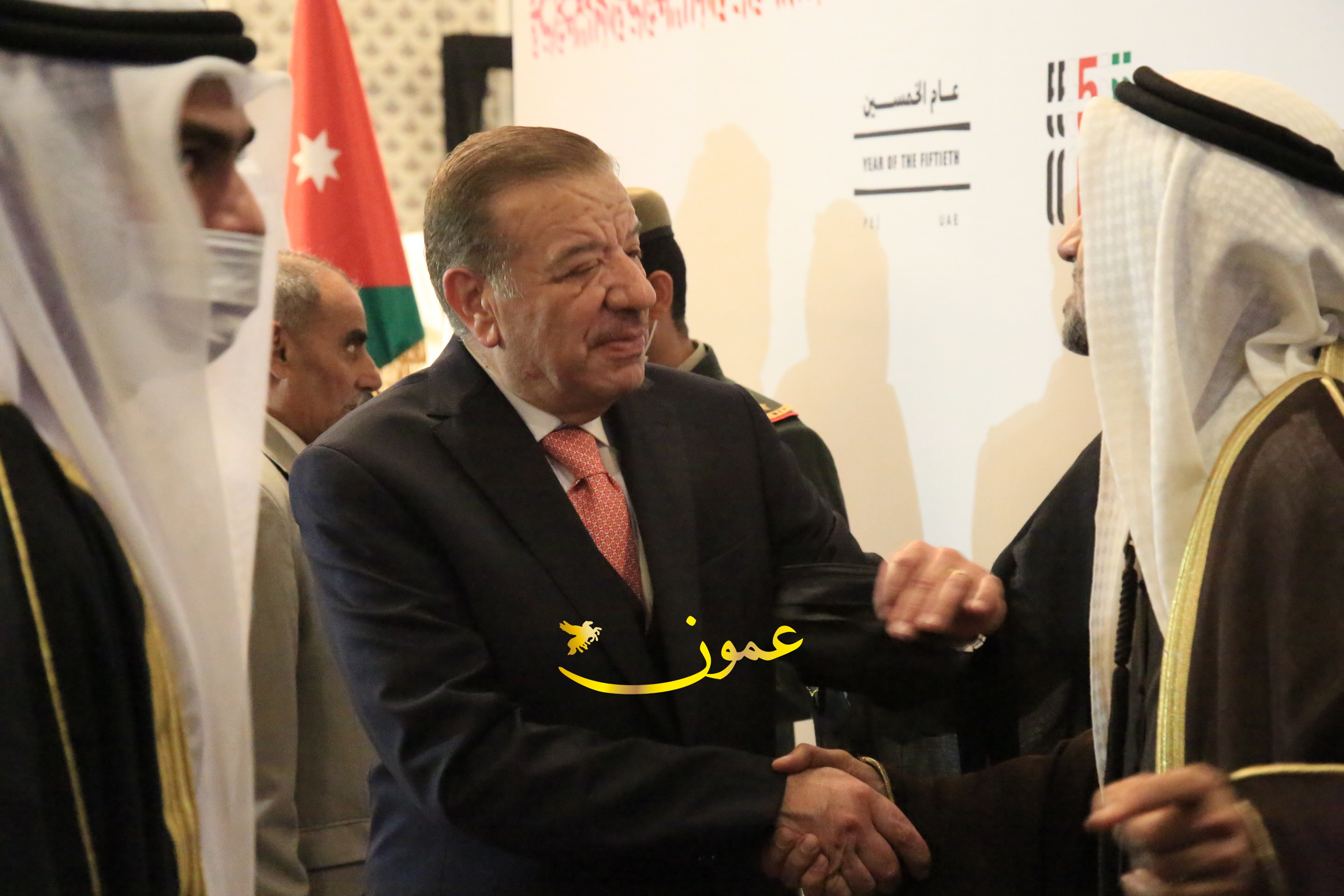 عمون - بمناسبة عيد الاتحاد الخمسين لدولة الإمارات العربية المتحدة، استقبل سفير دولة الإمارات العربية المتحدة لدى المملكة الأردنية الهاشمية أحمد علي البلوشي مساء الأربعاء في الإحتفال الذي أقامته السفارة الإماراتية بالعاصمة الأردنية عمّان، كبار المسؤولين الأردنيين يتقدمهم رئيس مجلس الأعيان فيصل الفايز، ورئيس مجلس النواب عبدالكريم الدغمي، ورئيس الديوان الملكي يوسف العيسوي، وعدد من أصحاب المعالي والسعادة: الوزراء والأعيان والنواب وكبار رجال السلك الدبلوماسي والعسكري والقضائي ورؤساء البعثات الدبلوماسية العربية والأجنبية وشخصيات سياسية واقتصادية وثقافية وإعلامية ومسؤولي مؤسسات المجتمع المدني والمنظمات الدولية، إضافة إلى شيوخ العشائر من مختلف محافظات المملكة.