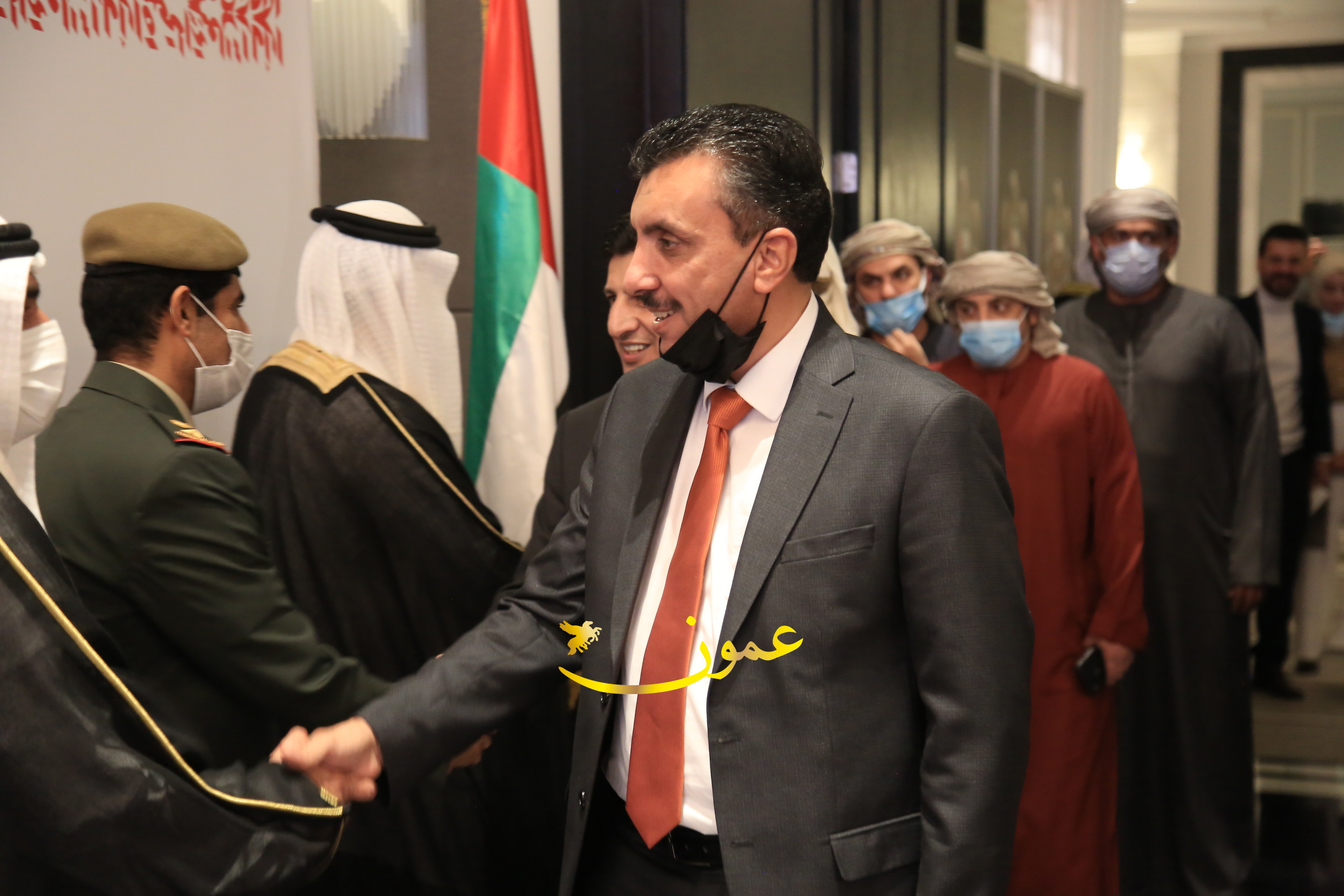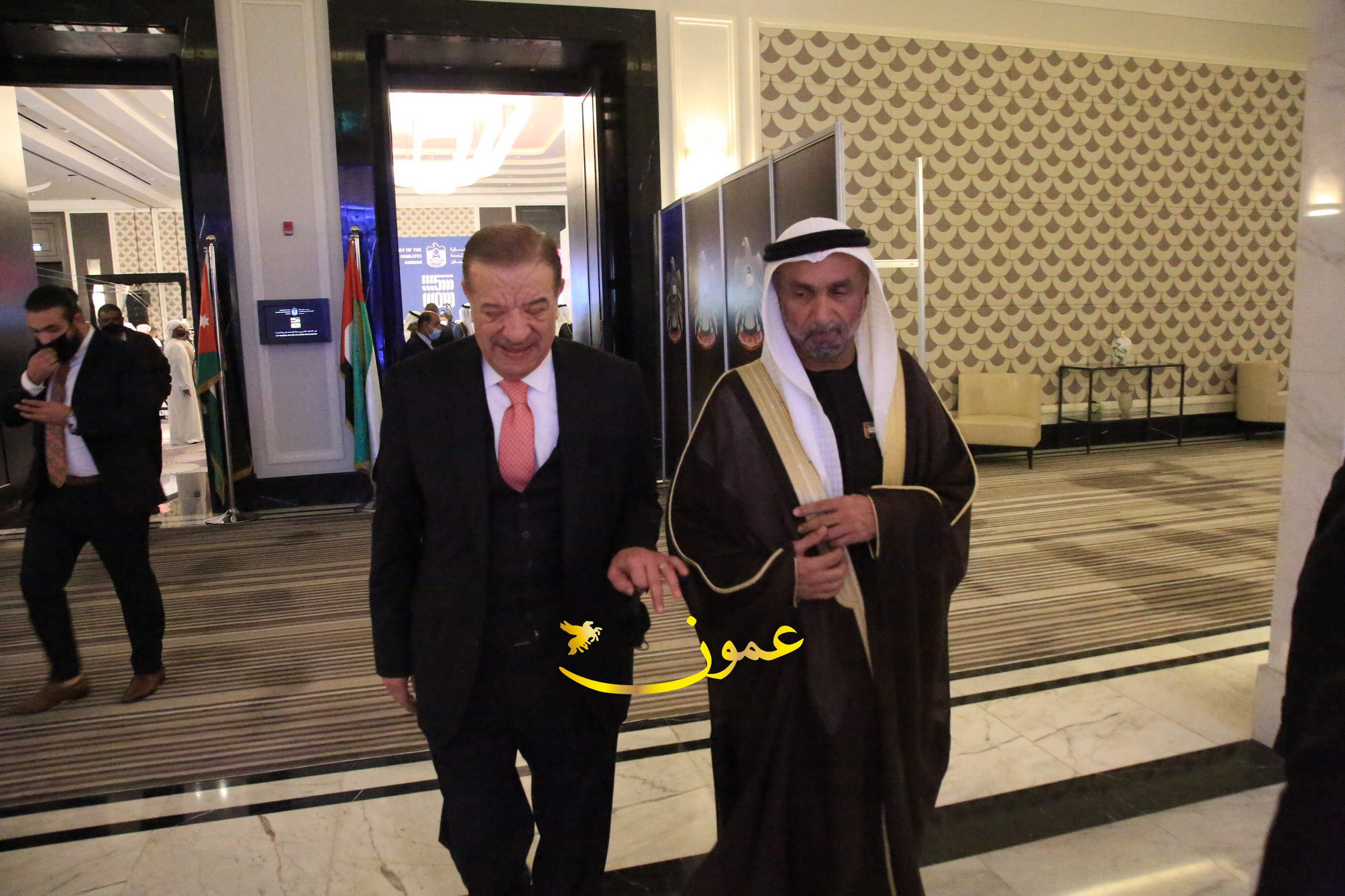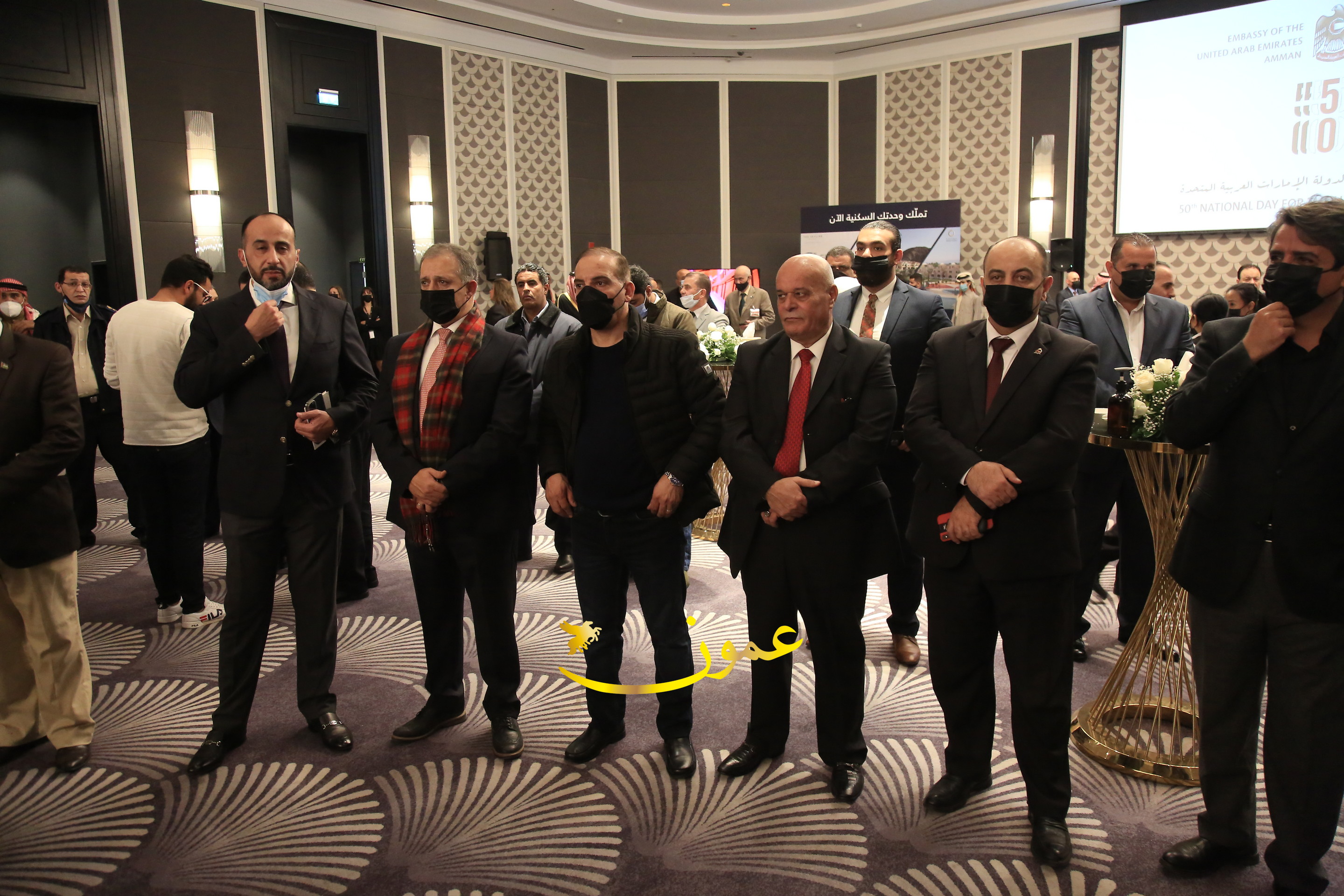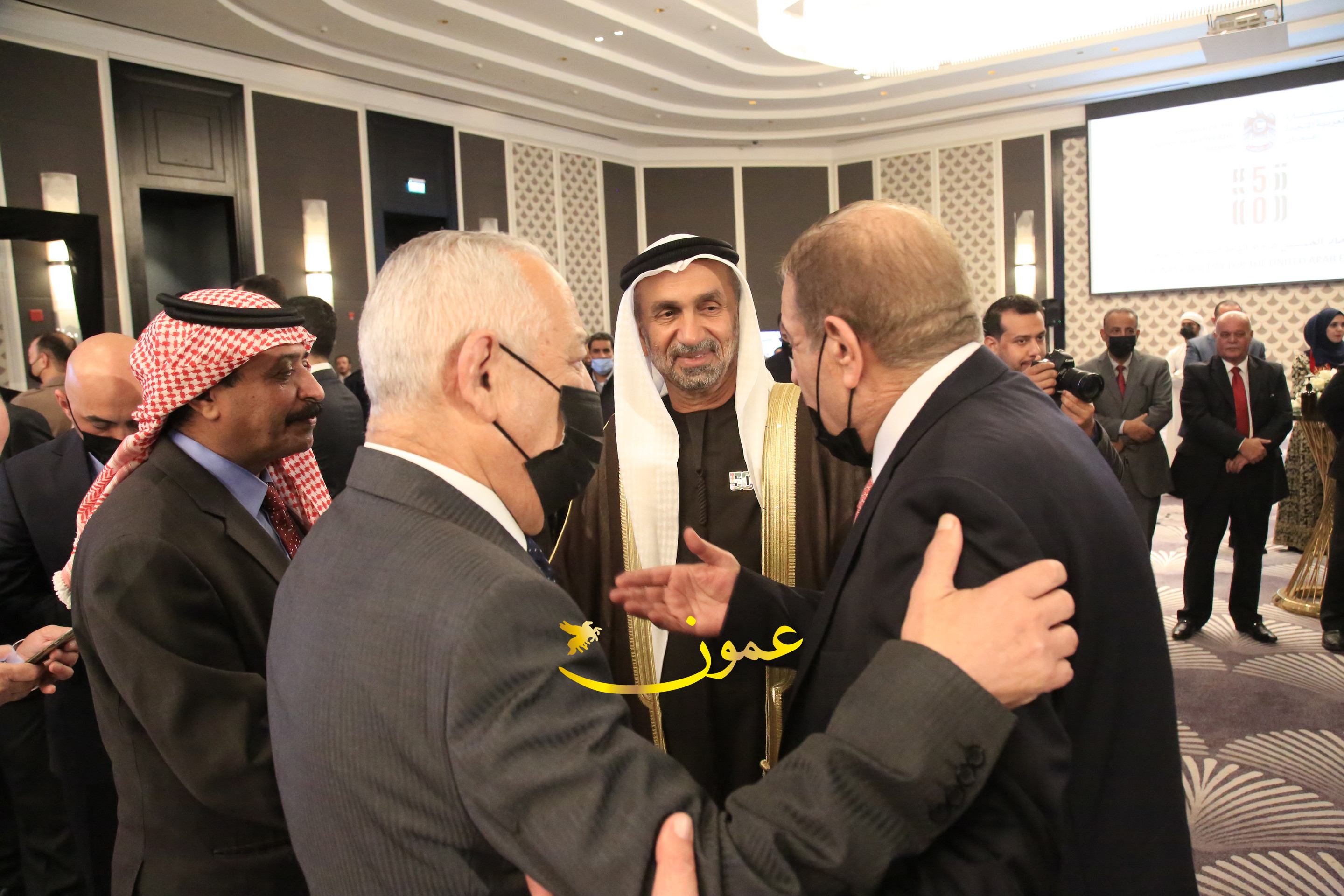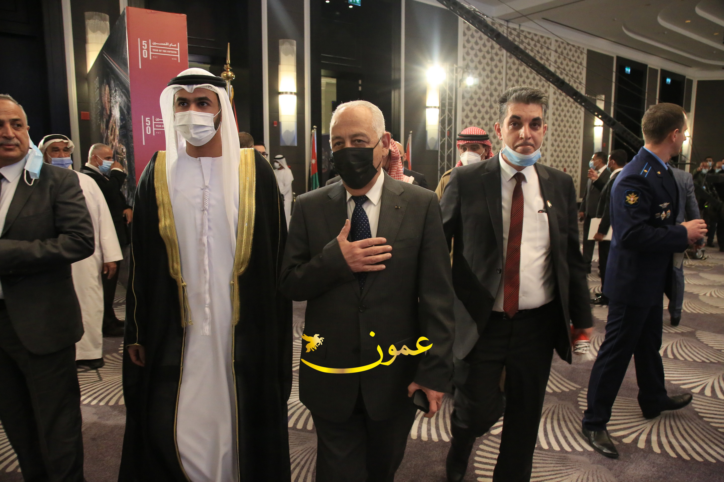 عمون - بمناسبة عيد الاتحاد الخمسين لدولة الإمارات العربية المتحدة، استقبل سفير دولة الإمارات العربية المتحدة لدى المملكة الأردنية الهاشمية أحمد علي البلوشي مساء الأربعاء في الإحتفال الذي أقامته السفارة الإماراتية بالعاصمة الأردنية عمّان، كبار المسؤولين الأردنيين يتقدمهم رئيس مجلس الأعيان فيصل الفايز، ورئيس مجلس النواب عبدالكريم الدغمي، ورئيس الديوان الملكي يوسف العيسوي، وعدد من أصحاب المعالي والسعادة: الوزراء والأعيان والنواب وكبار رجال السلك الدبلوماسي والعسكري والقضائي ورؤساء البعثات الدبلوماسية العربية والأجنبية وشخصيات سياسية واقتصادية وثقافية وإعلامية ومسؤولي مؤسسات المجتمع المدني والمنظمات الدولية، إضافة إلى شيوخ العشائر من مختلف محافظات المملكة.
