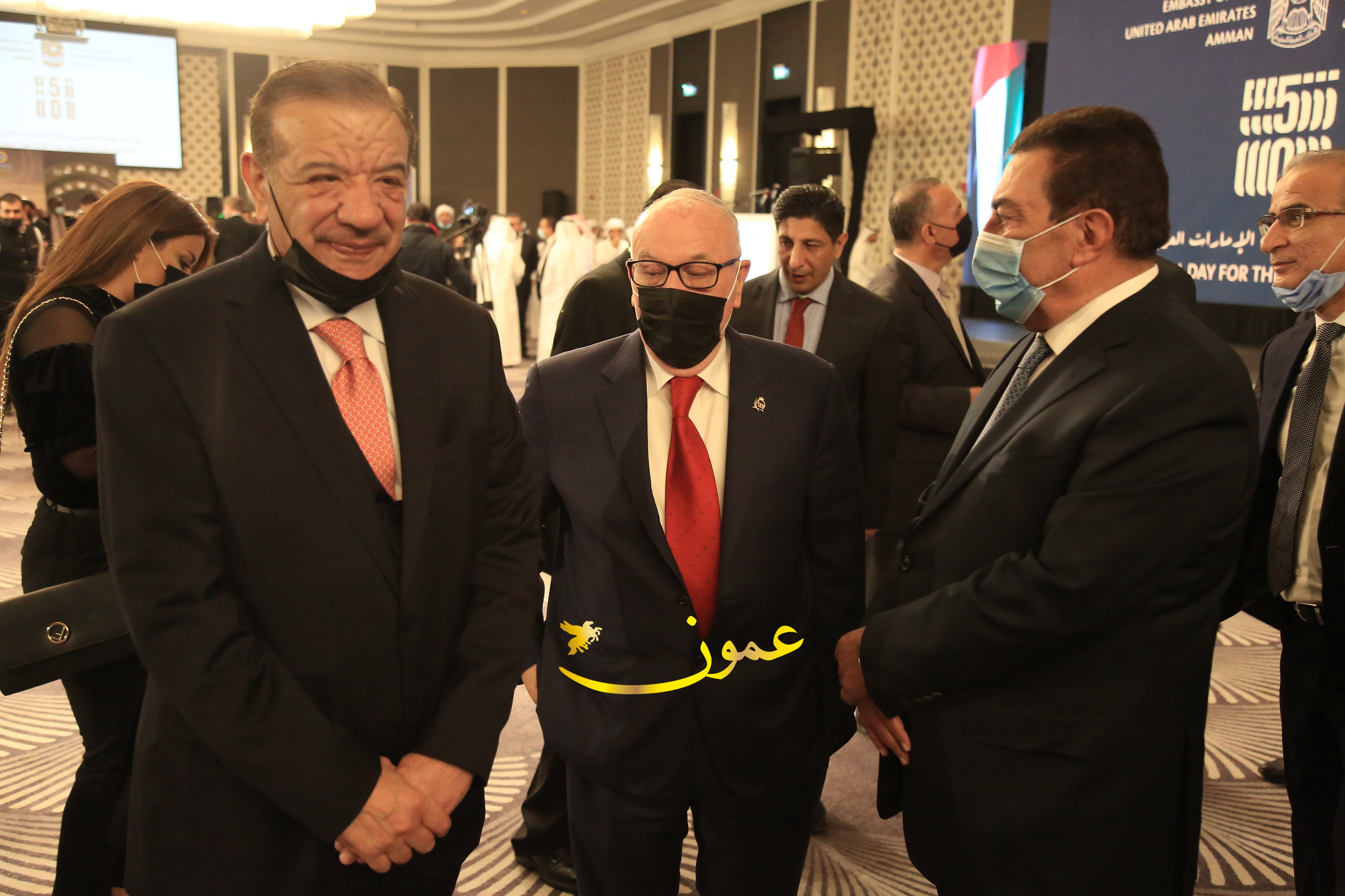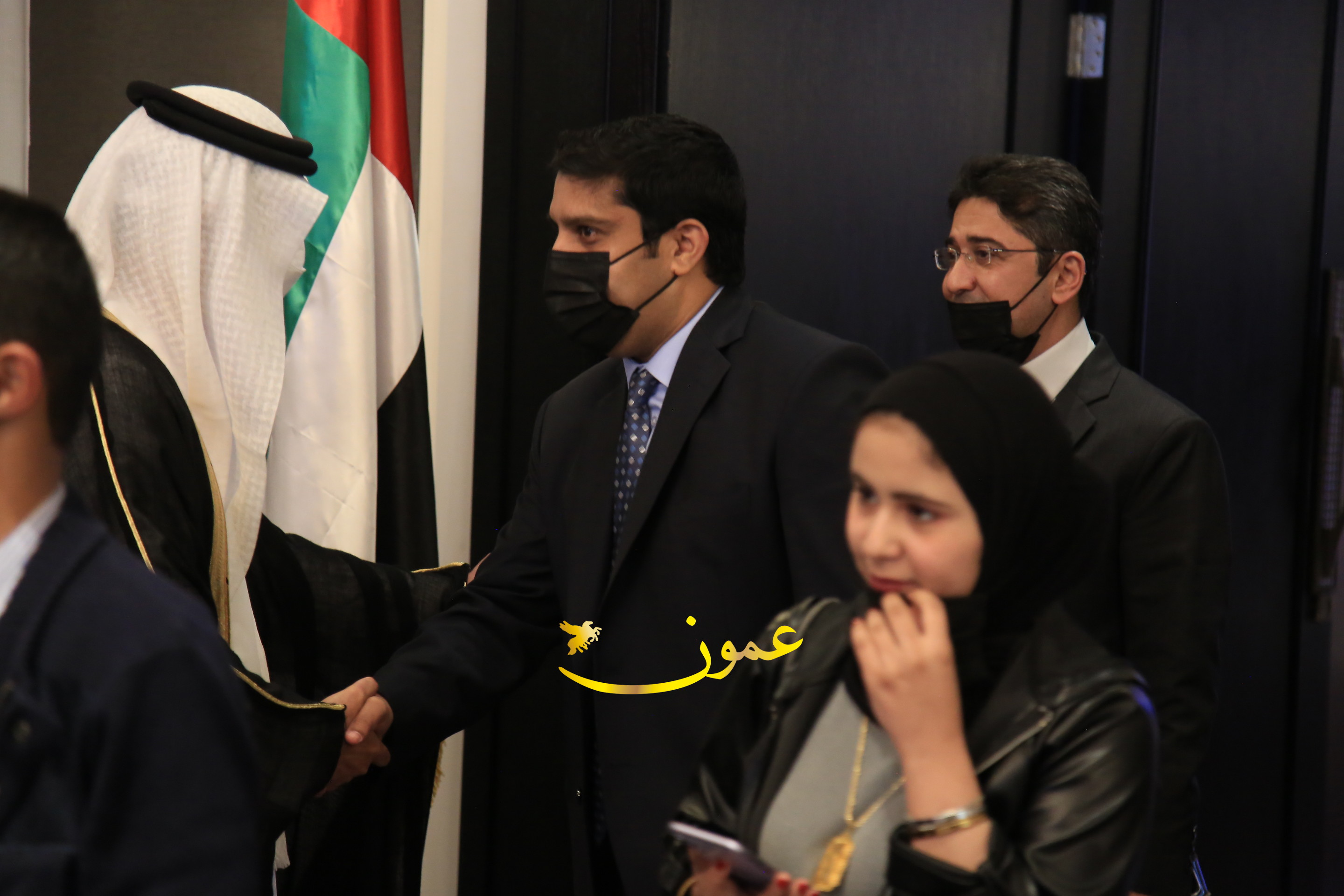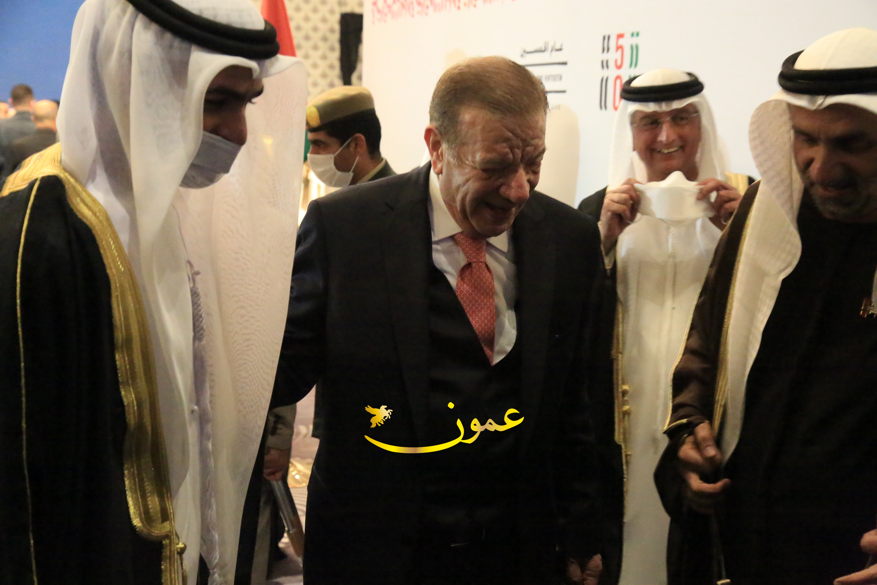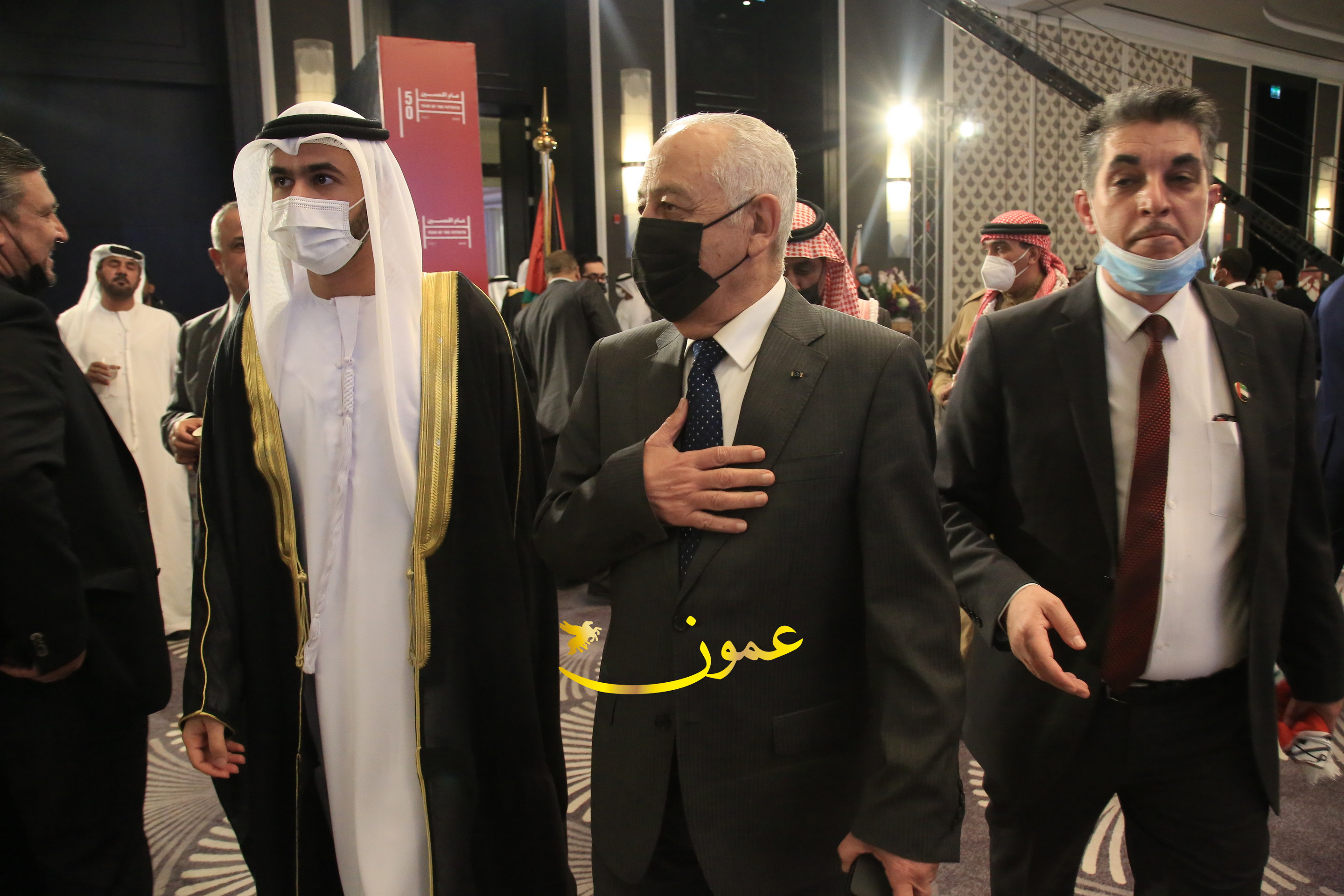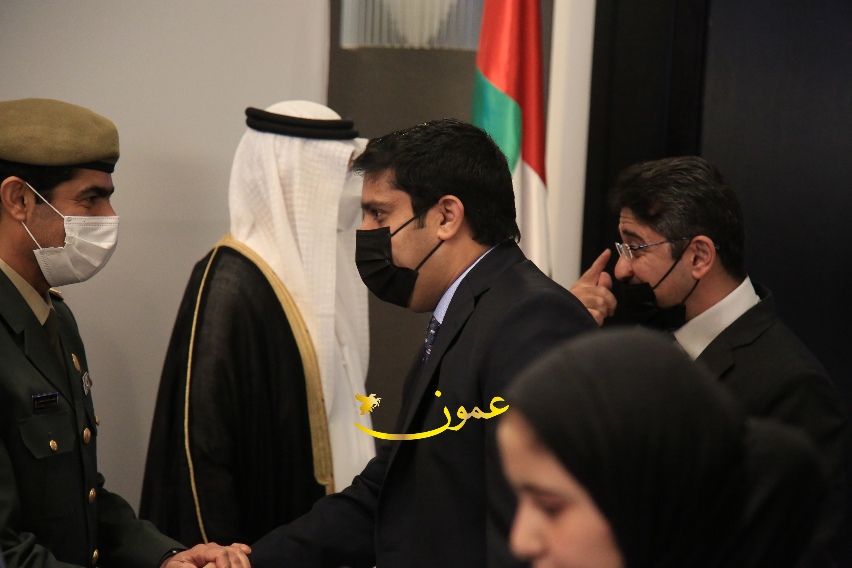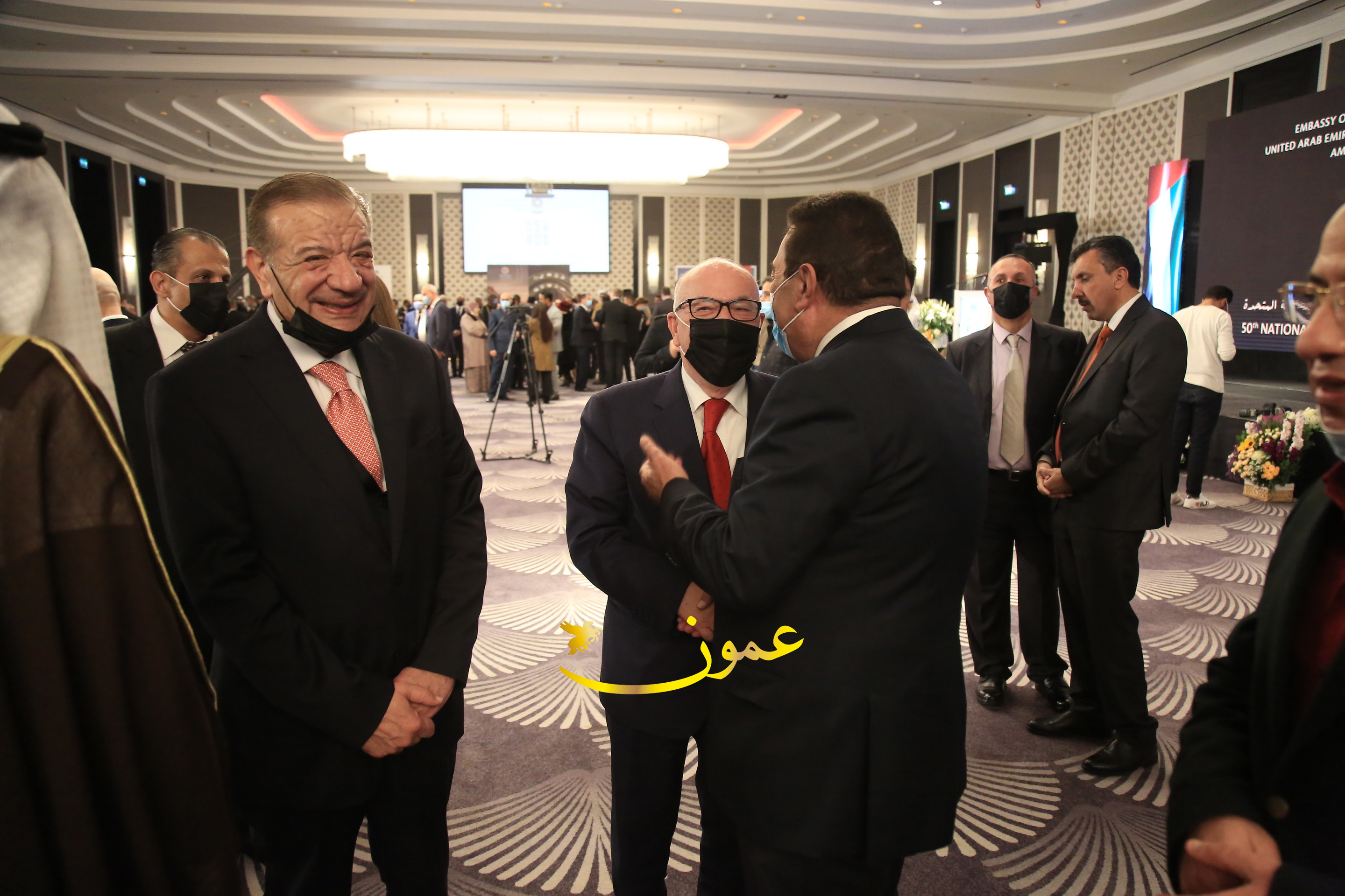 عمون - بمناسبة عيد الاتحاد الخمسين لدولة الإمارات العربية المتحدة، استقبل سفير دولة الإمارات العربية المتحدة لدى المملكة الأردنية الهاشمية أحمد علي البلوشي مساء الأربعاء في الإحتفال الذي أقامته السفارة الإماراتية بالعاصمة الأردنية عمّان، كبار المسؤولين الأردنيين يتقدمهم رئيس مجلس الأعيان فيصل الفايز، ورئيس مجلس النواب عبدالكريم الدغمي، ورئيس الديوان الملكي يوسف العيسوي، وعدد من أصحاب المعالي والسعادة: الوزراء والأعيان والنواب وكبار رجال السلك الدبلوماسي والعسكري والقضائي ورؤساء البعثات الدبلوماسية العربية والأجنبية وشخصيات سياسية واقتصادية وثقافية وإعلامية ومسؤولي مؤسسات المجتمع المدني والمنظمات الدولية، إضافة إلى شيوخ العشائر من مختلف محافظات المملكة.