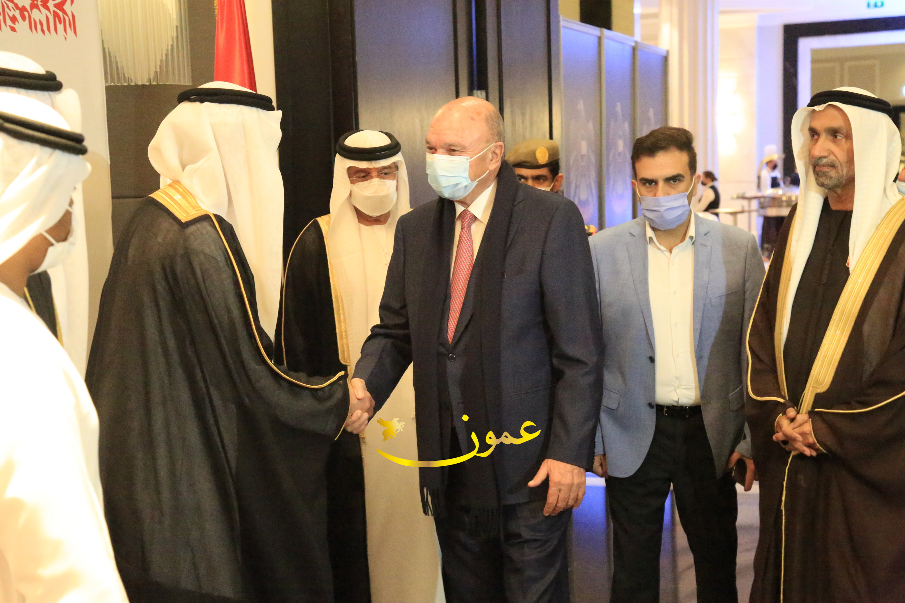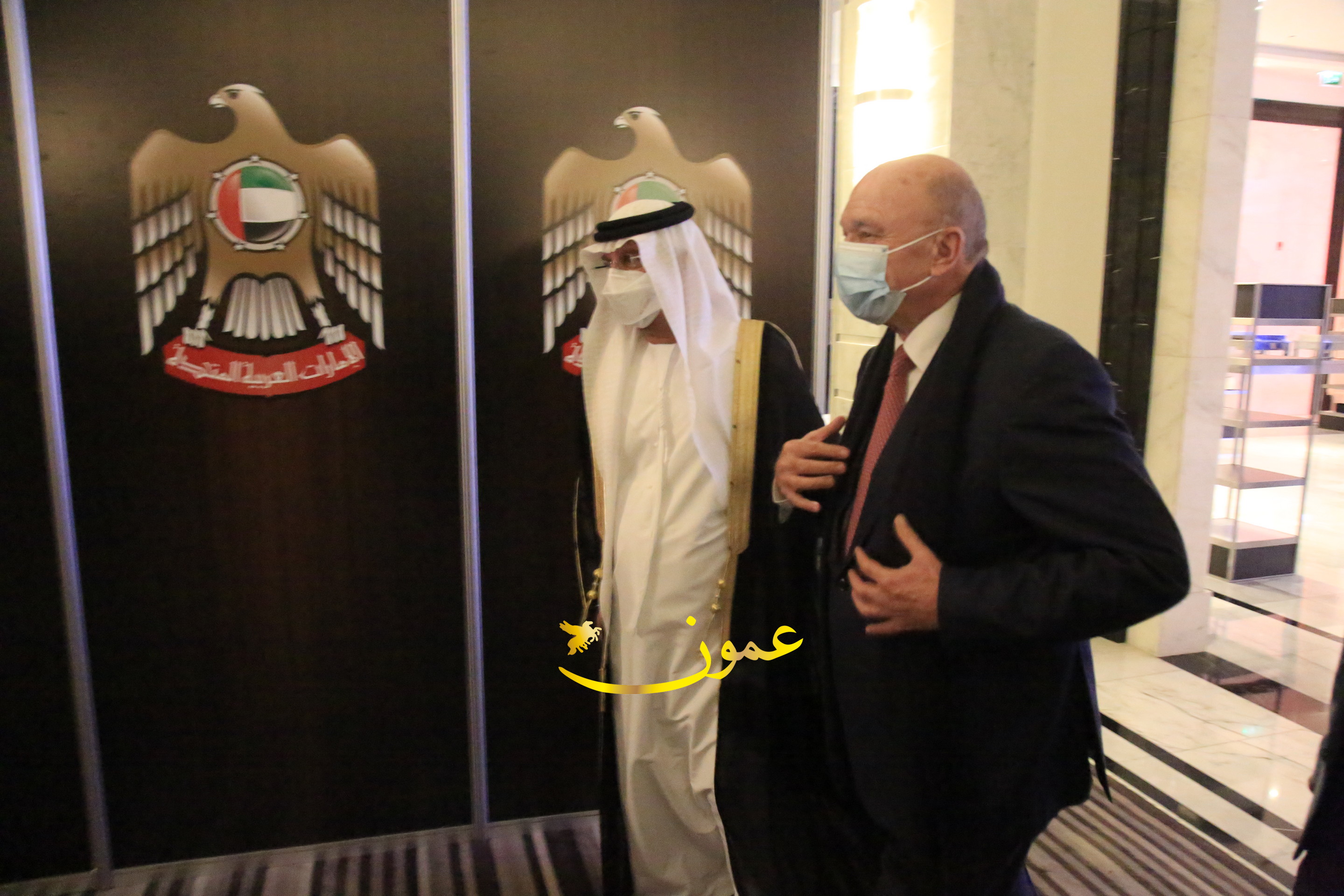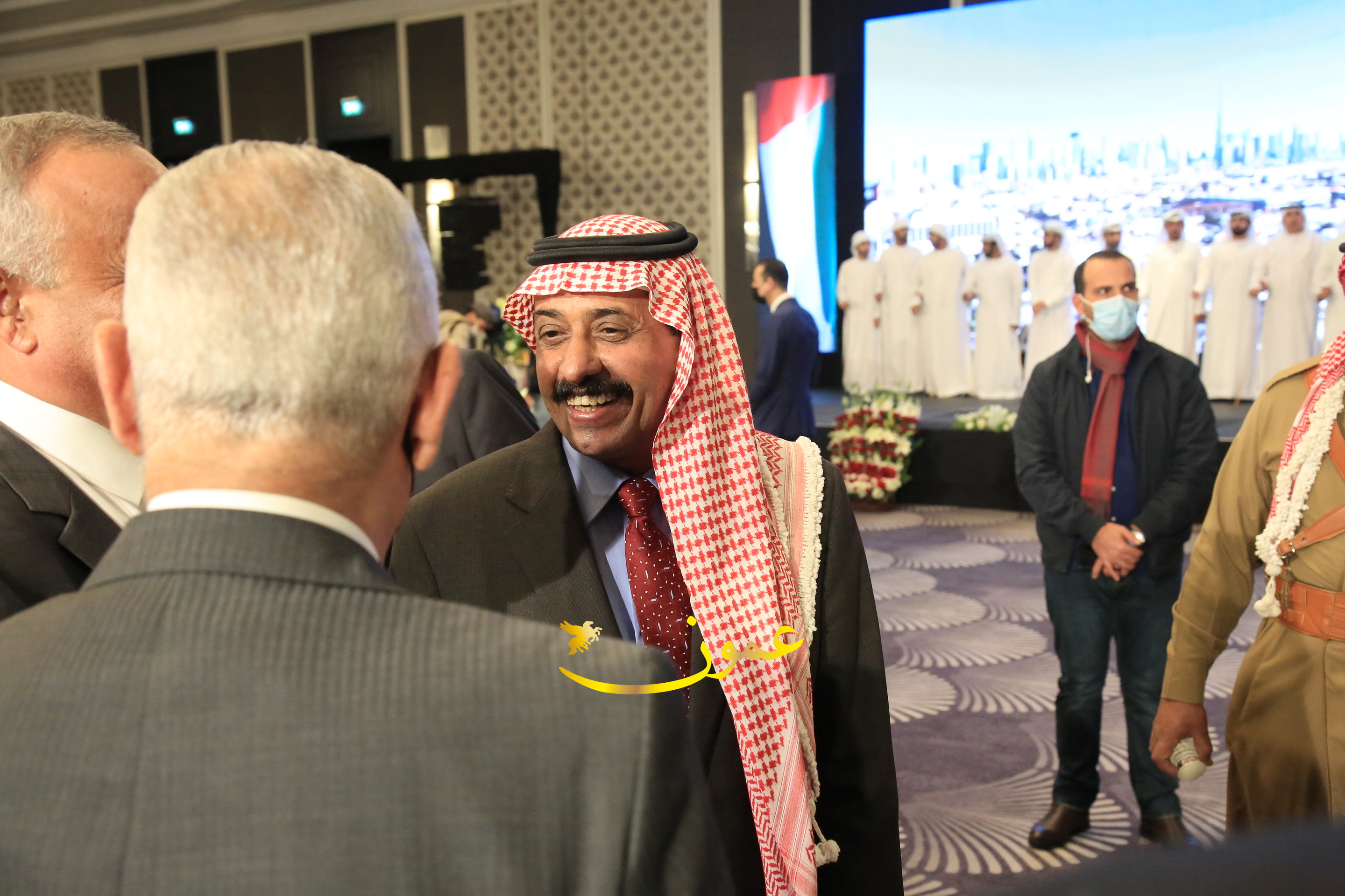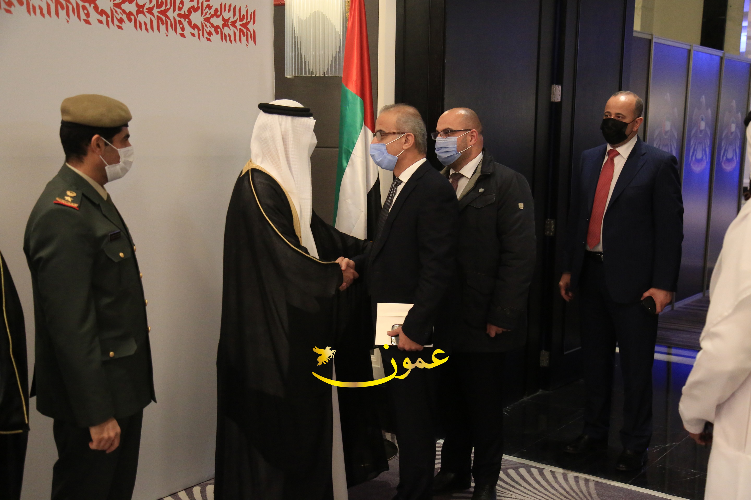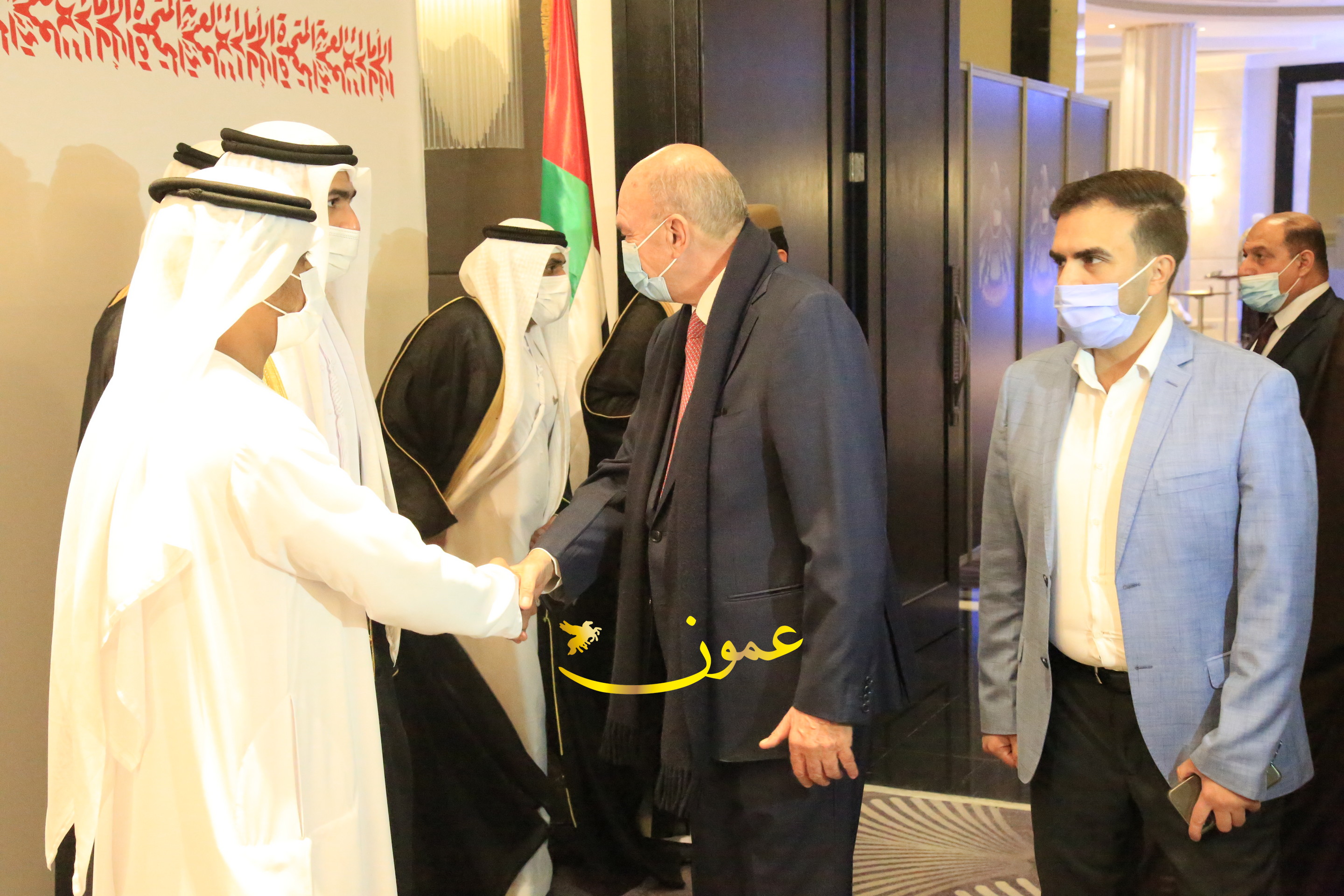 عمون - بمناسبة عيد الاتحاد الخمسين لدولة الإمارات العربية المتحدة، استقبل سفير دولة الإمارات العربية المتحدة لدى المملكة الأردنية الهاشمية أحمد علي البلوشي مساء الأربعاء في الإحتفال الذي أقامته السفارة الإماراتية بالعاصمة الأردنية عمّان، كبار المسؤولين الأردنيين يتقدمهم رئيس مجلس الأعيان فيصل الفايز، ورئيس مجلس النواب عبدالكريم الدغمي، ورئيس الديوان الملكي يوسف العيسوي، وعدد من أصحاب المعالي والسعادة: الوزراء والأعيان والنواب وكبار رجال السلك الدبلوماسي والعسكري والقضائي ورؤساء البعثات الدبلوماسية العربية والأجنبية وشخصيات سياسية واقتصادية وثقافية وإعلامية ومسؤولي مؤسسات المجتمع المدني والمنظمات الدولية، إضافة إلى شيوخ العشائر من مختلف محافظات المملكة.