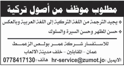 مطلوب موظف من أصول تركية للعمل بشركة في عمان