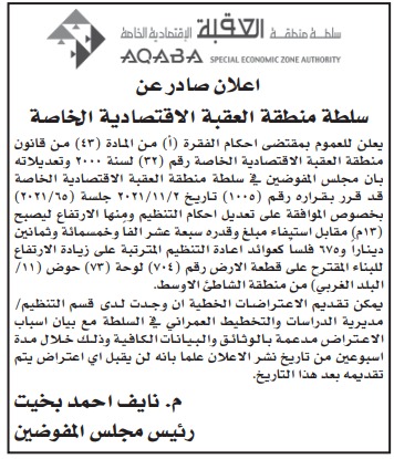 عطاء صادر عن سلطة العقبة الاقتصادية الخاصة