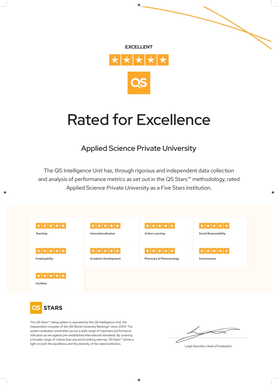 حصلت جامعة العلوم التطبيقية الخاصة على خمسة نجوم في التقييم العالمي "QS Stars Rating" من خلال حصولها على خمسة نجوم في كافة معايير هذا التقييم وهي:التدريس، التوظيف، الشمولية، العالمية، المرافق، التعليم الإلكتروني، خدمة المجتمع، التطور الأكاديمي، وتخصص الصيدلة، لتكون بذلك أول جامعة خاصة تحصل على هذا التقييم في الأردن.