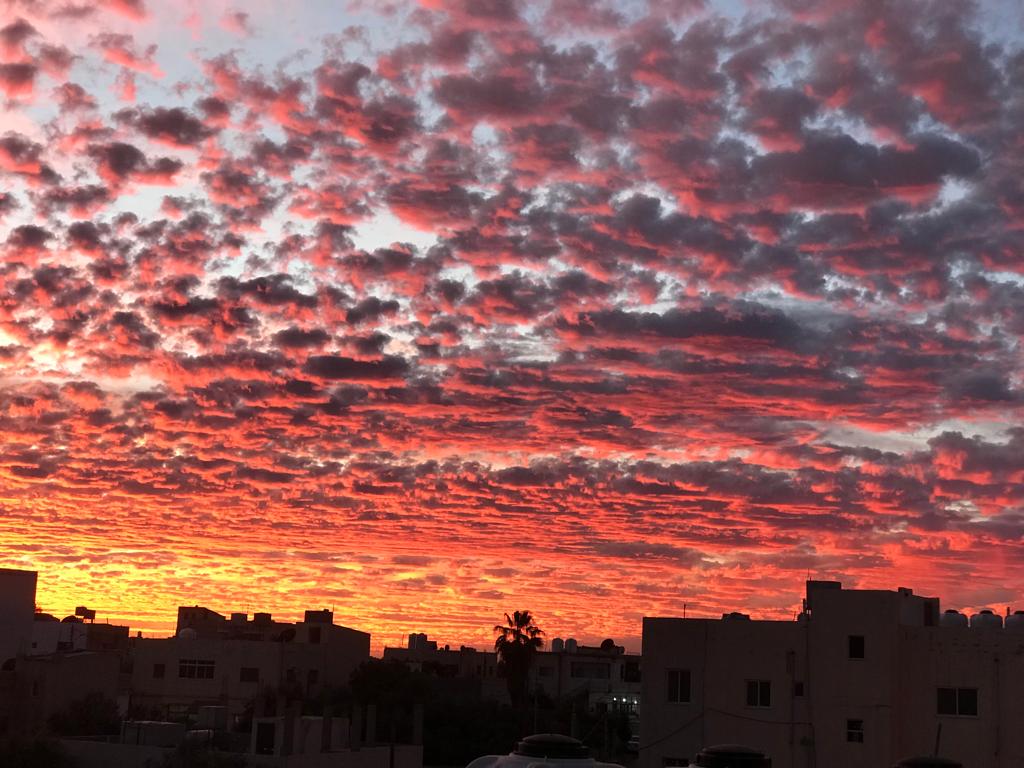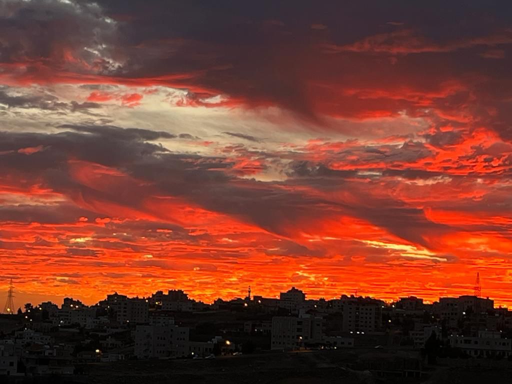 عمون - من اخلاص القاضي - قال الراصد الفلكي عماد مجاهد إن لون الغيوم المائل للاحمرار، والذي زين سماء المملكة اليوم، يحصل عادة بسبب الرطوبة العالية والبرودة الشديدة، وتحديدا عند غروب الشمس. |