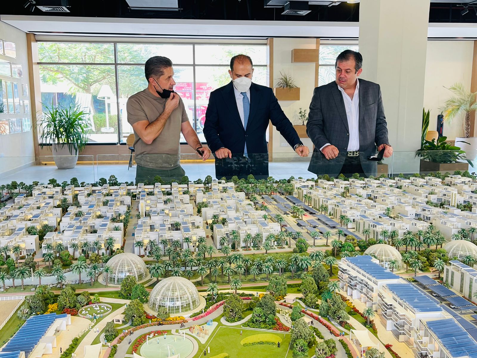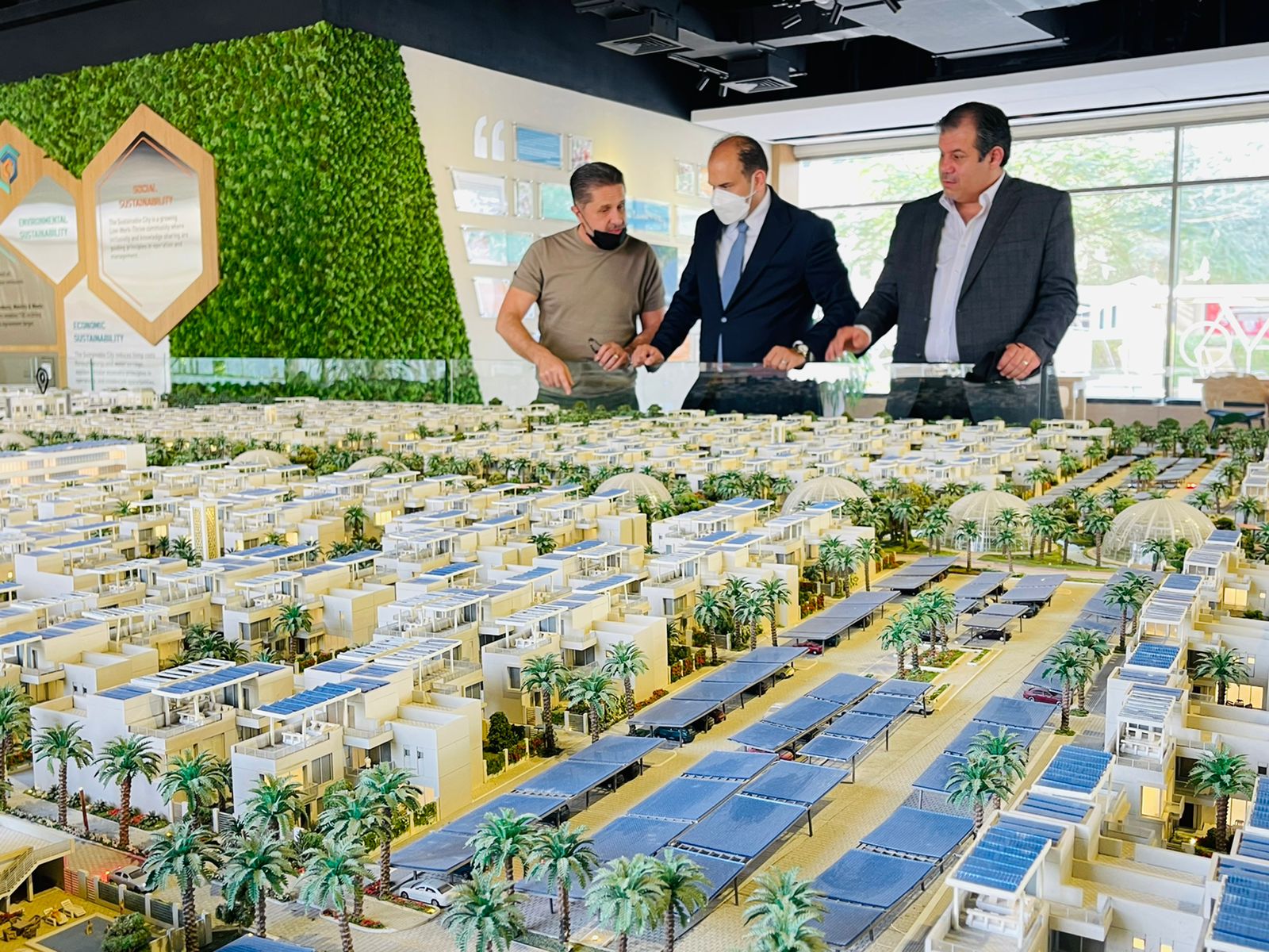عمون - زار أمين عام وزارة الاستثمار، المفوض العام الأردني في اكسبو 2020 دبي زاهر القطارنة يرافقه المستشار الاقتصادي بالسفارة الأردنية بالإمارات - دبي نائب المفوض العام الاردني لإكسبو دبي ٢٠٢٠ نادر السحيم مشروع المدينة المستدامة؛ أول مجتمع مستدام بالكامل ضمن فئته بمنطقة الشرق الأوسط.