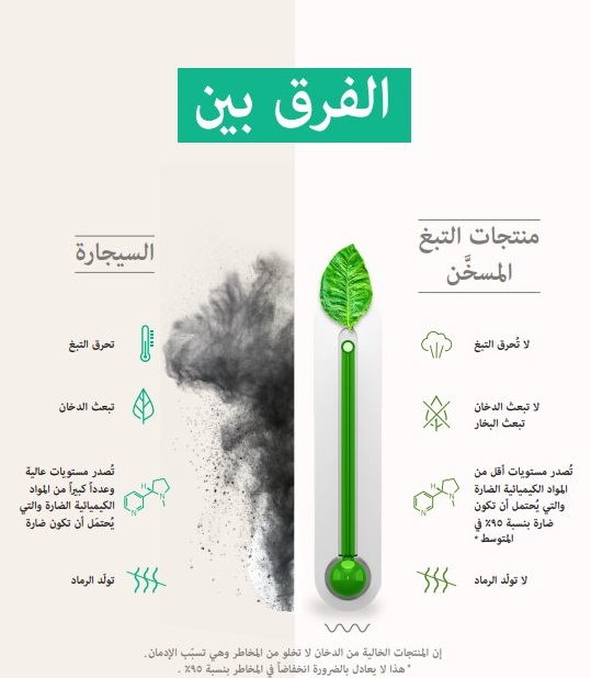 في الحالة المحدّدة الخاصة بمنتجات التبغ المسخن - وهي نوع من المنتجات الخالية من الدخان - يتم تسخين التبغ عند درجة حرارة مضبوطة دون حرق التبغ، مما يُسفر عن توليد رذاذ يحتوي على النيكوتين، وهذا الرذاذ الناتج عن منتجات التبغ المسخن يختلف في تكوينه عن دخان السجائر. في حالة السجائر، يشكل الماء والغليسيرين 50 في المائة من كتلة الدخان، جنباً إلى جنب مع مستويات عالية من المواد السامة وكذلك جزيئات الكربون الصلبة. على النقيض من ذلك، تظهر الدراسات العلمية إن الماء والغليسيرين يشكلان نسبة 90 في المائة في الرذاذ الناجم عن منتجات التبغ المسخّن، ولا توجد جزيئات صلبة وتنخفض مستويات المواد السامة في المتوسط بنسبة 90 في المائة مقارنة بدخان السجائر. وهنا تجدر الإشارة إلى أنه يجب ملاحظة أن هذه المنتجات ليست خالية من المخاطر لأنها تحتوي على النيكوتين الذي يسبب الإدمان.
