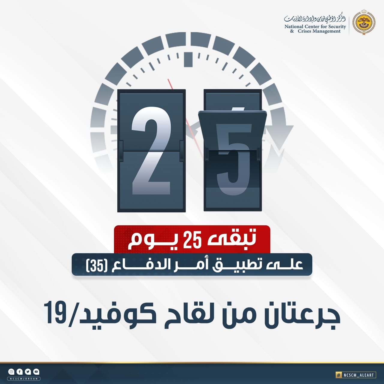 وتالياً نصه: أمر دفاع رقم (35) لسنة 2021صادر بمقتضى أحكام قانون الدفاع رقم (13) لسنة 1992انطلاقاً من دور الحكومة بمراجعة الإجراءات والتدابير المتخذة أثناء العمل بقانون الدفاع بما يحقق المصلحة العامة والحد من انتشار وباء فيروس كورونا في المملكة، أقرر إصدار أمر الدفاع التالي: أولا: لا يسمح لموظف القطاع العام أو العامل في منشآت القطاع الخاص الالتحاق بالعمل إلا إذا تلقى جرعتي مطعوم كوفيد- 19، وتحسم الأيام التي لا يسمح له بالدوام أو العمل فيها من رصيد اجازاته السنوية، وفي حال استنفاذ رصيد اجازاته السنوية يعتبر في إجازة بدون راتب وعلاوات ولا يستحق خلال تلك الفترة أي راتب أو علاوة أو مكافأة.