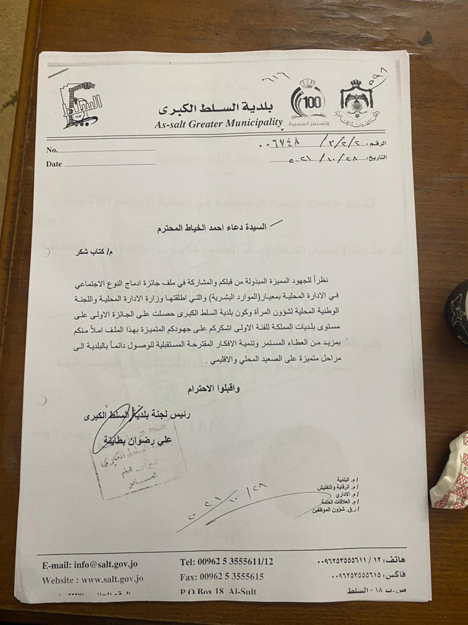 عمون - وجه رئيس لجنة بلدية السلط الكبرى على بطاينة كتاب شكر للموظفة دعاء احمد الخياط لجهودها المتميزة المبذولة ومشاركتها في ملف ادماج النوع الاجتماعي في الإدارة المحلية بمعيار (الموارد البشرية) والتي اطلقتها وزارة الإدارة المحلية واللجنة الوطنية المحلية لشؤون المرأة وحصلت البلدية على الجائزة الأولى على مستوى بلديات المملكة. |