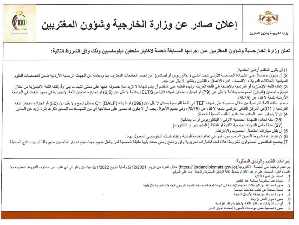 عمون - أعلنت وزارة الخارجية وشؤون المغتربين، عن توفر شواغر وظيفية "ملحق دبلوماسي" من خلال مسابقة عامة، وفق الشروط التالية: