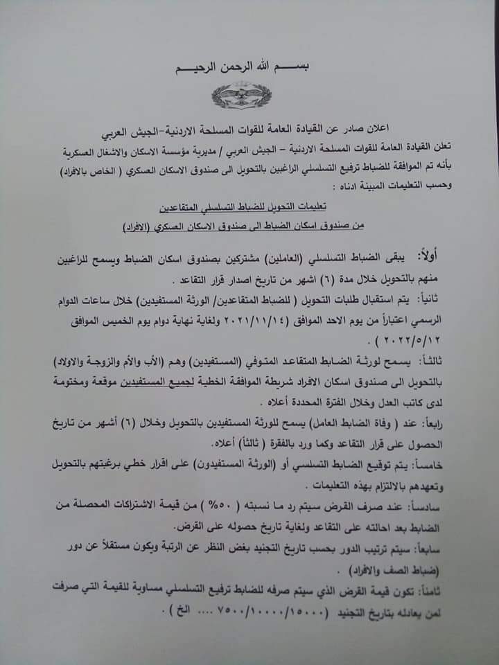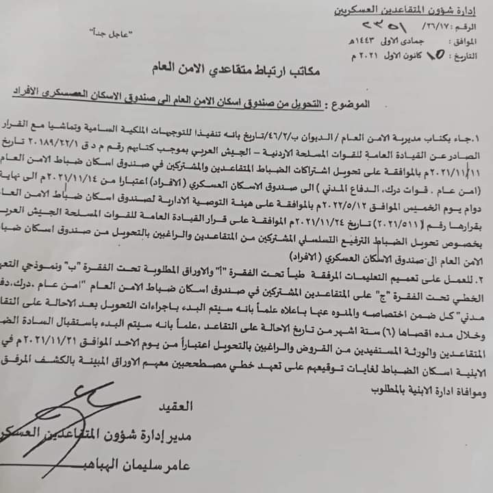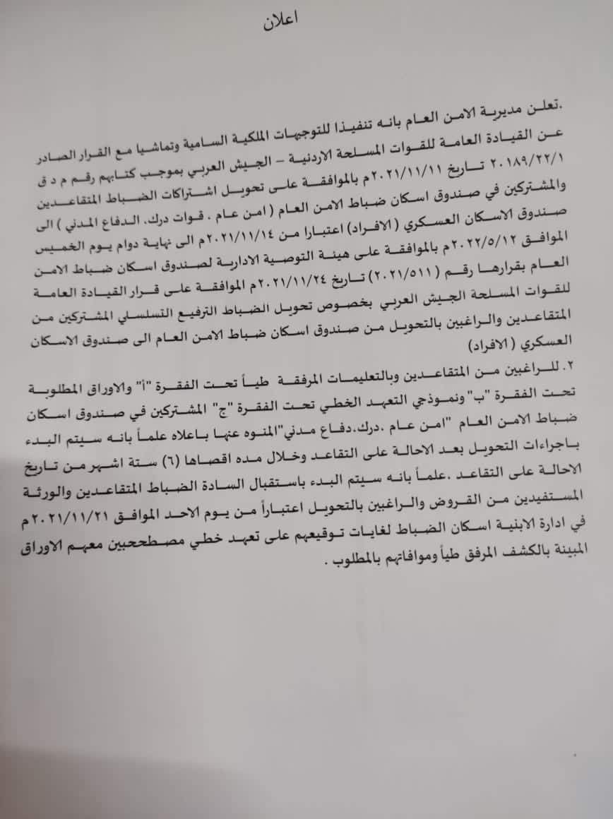 عمون - ينال المعاني - وافقت مديرية الامن العام على تحويل اشتراكات الضباط المتقاعدين والمشتركين في صندوق اسكان ضباط الامن العام (امن عام، قوات درك، الدفاع المدني) الى صندوق الاسكان العسكري (الافراد) اعتبارا من تاريخ 14/11/2021 الى نهاية دوام يوم الخميس الموافق 12/5/2022. |