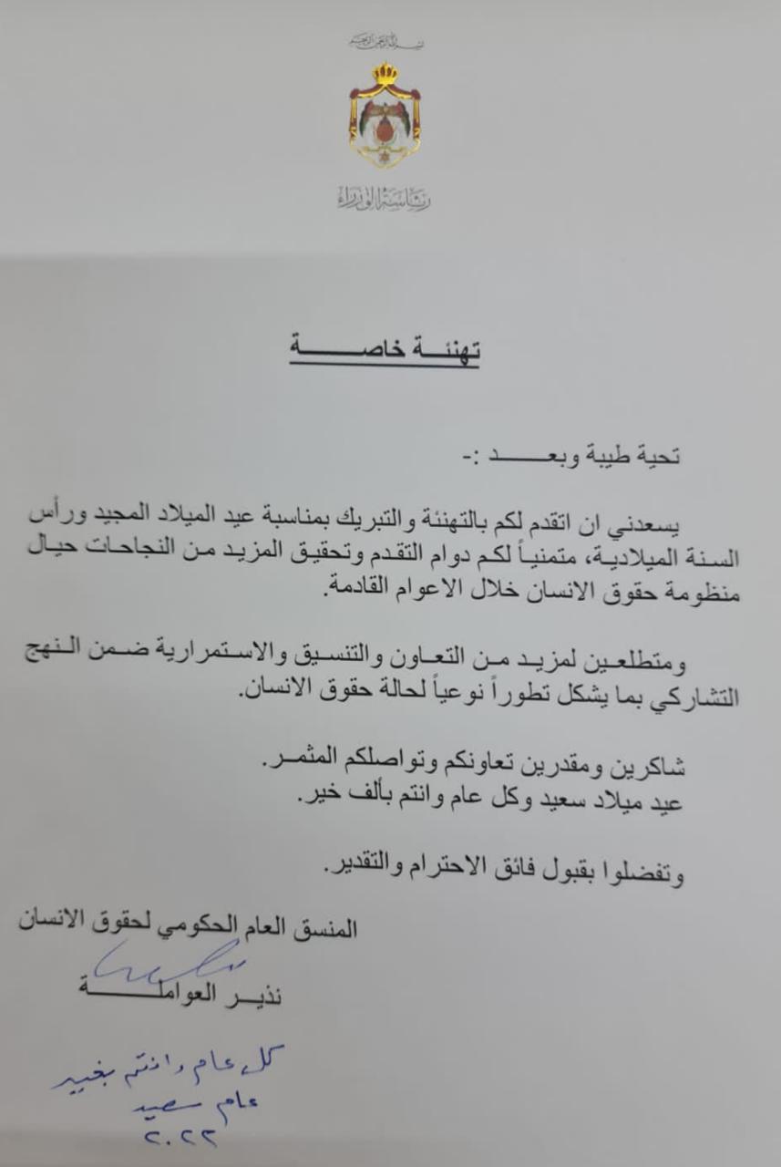 عمون - يتقدم المنسق العام الحكومي لحقوق الإنسان نذير العواملة بالتهنئة والتبريك بمناسبة عيد الميلاد المجيد ورأس السنة الميلادية، متمنياً دوام التوافيق وتحقيق المزيد من النجاحات حيال منظومة حقوق الإنسان خلال الأعوام القادم. |