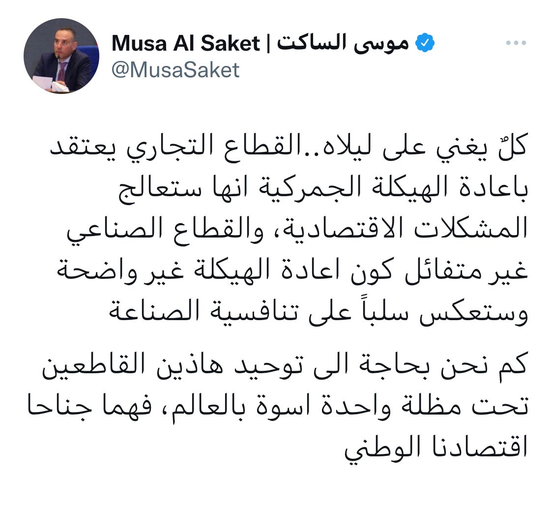 عمون - قال الاقتصادي المهندس موسى الساكت إن "القطاع التجاري يعتقد باعادة الهيكلة الجمركية انها ستعالج المشكلات الاقتصادية، والقطاع الصناعي غير متفائل كون اعادة الهيكلة غير واضحة وستنعكس سلباً على تنافسية الصناعة". |