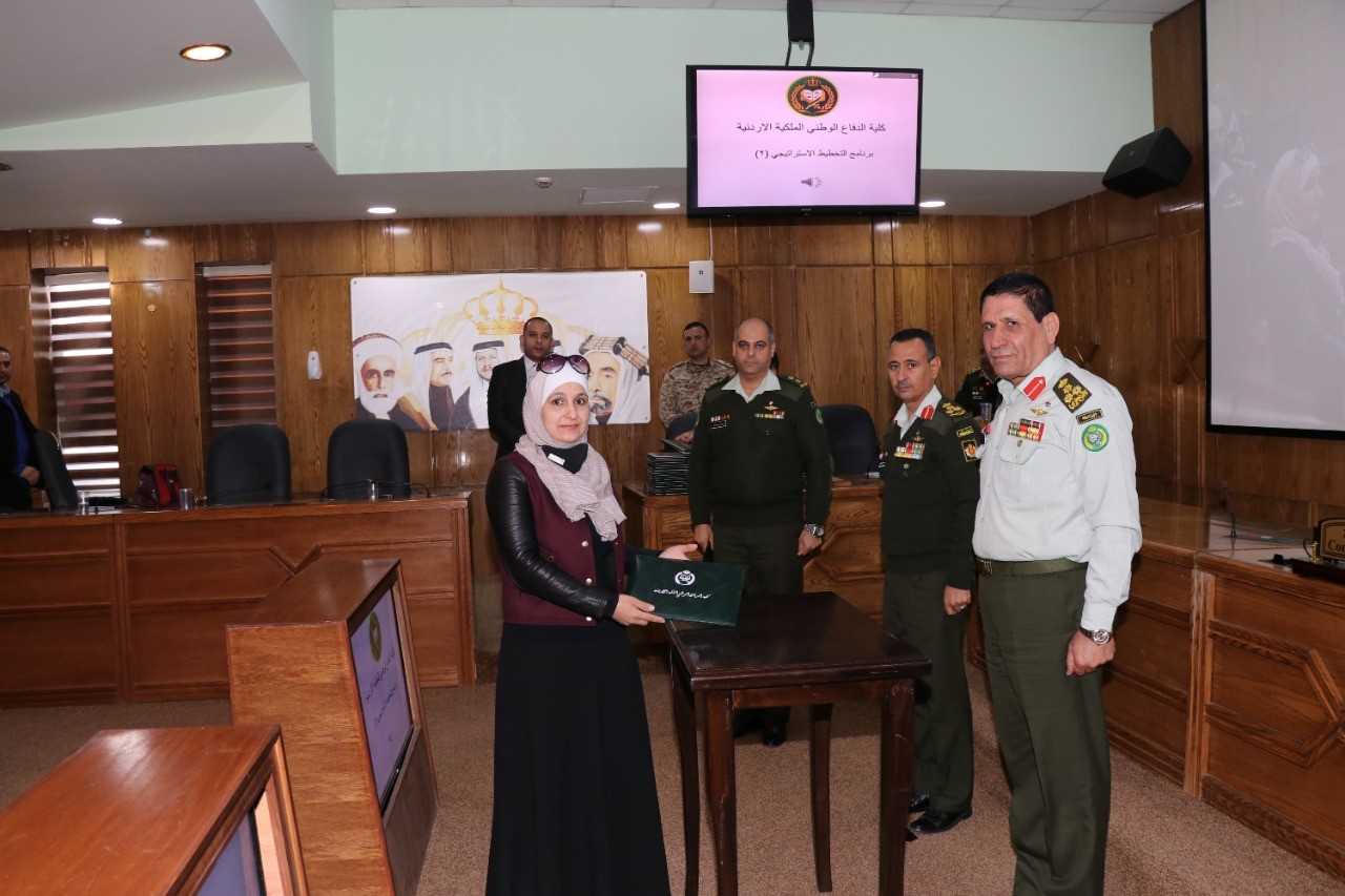 يشار إلى أن برنامج التخطيط الاستراتيجي الأول جرى تخريجه الأسبوع الماضي في كلية الدفاع الوطني الملكية الأردنية، وأن الكلية تهتم بإعداد عناصر قيادية من قطاعات الدولة المختلفة (عسكريين ومدنيين) من خلال دراسة وتحليل العناصر الأساسية المؤثرة في الأمن الوطني، وتأهيل ضباط منتخبين من القوات المسلحة الأردنية والدول الشقيقة والصديقة لإشغال مناصب مهمة وبارزة في أوقات الحرب والسلم، وتثقيف القيادات المختلفة في الدولة في مجال الأمن الوطني واستراتيجية الدولة، وإجراء الدراسات الاستراتيجية في القضايا المرتبطة بالأمن الوطني في الظروف الراهنة.