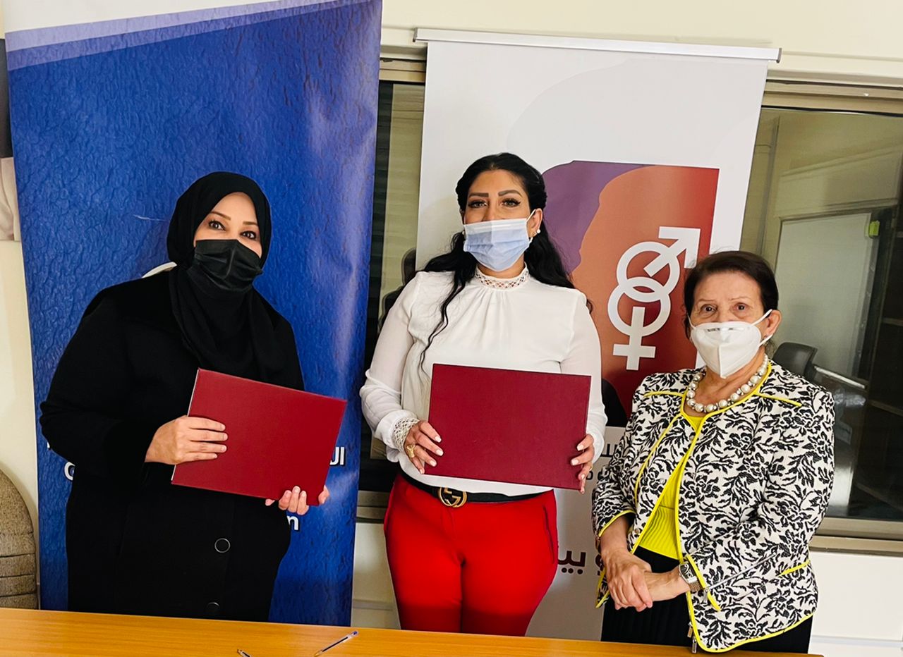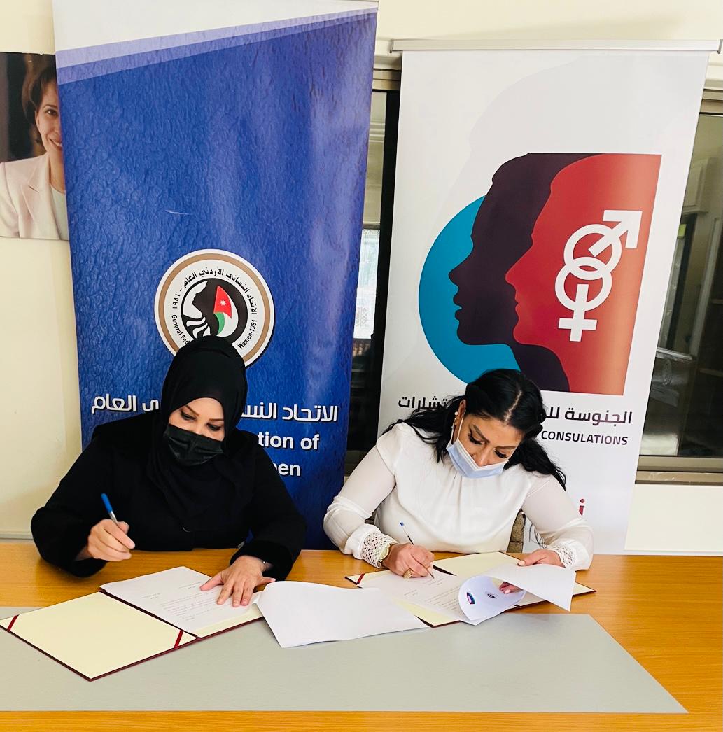 وقع المذكرة الدكتورة ميسون تليلان السليًم رئيسة الإتحاد النسائي الأردني العام والدكتورة هبه حدادين المديرة التنفيذية لمؤسسة جنوسة للدراسات والاستشارات وبحضور السيدة كلثم مريش رئيسة الاتحاد النسائي لمحافظة العاصمة.