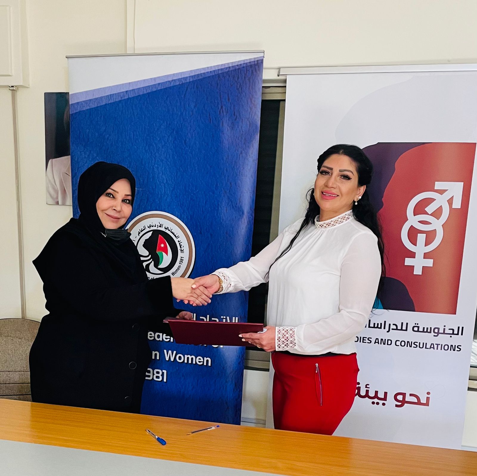 عمون - وقع الإتحاد النسائي الأردني العام ومؤسسة جنوسة للدراسات والاستشارات مذكرة تفاهم وتعاون مشترك تهدف الى تدريب السيدات المترشحات للانتخابات المقبلة ( اللامركزية ، البلدية ) والوصول الى جميع النساء الراغبات بالترشح للانتخابات المقبلة من مختلف محافظات المملكة بهدف تمكينهن وتزويدهن بالمهارات والمعارف اللازمة لخوض الانتخابات.