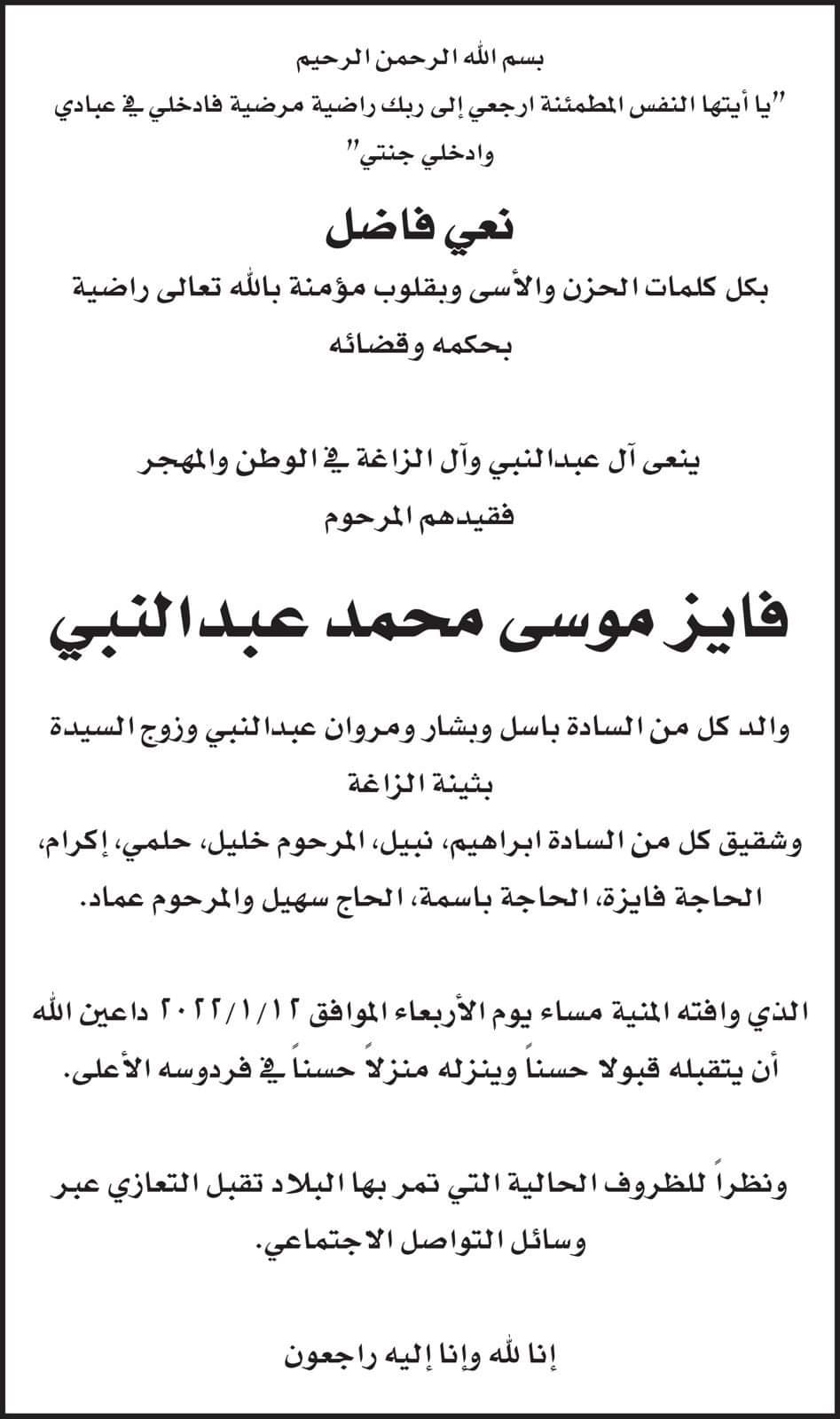 فايز موسى محمد عبدالنبي في ذمة الله