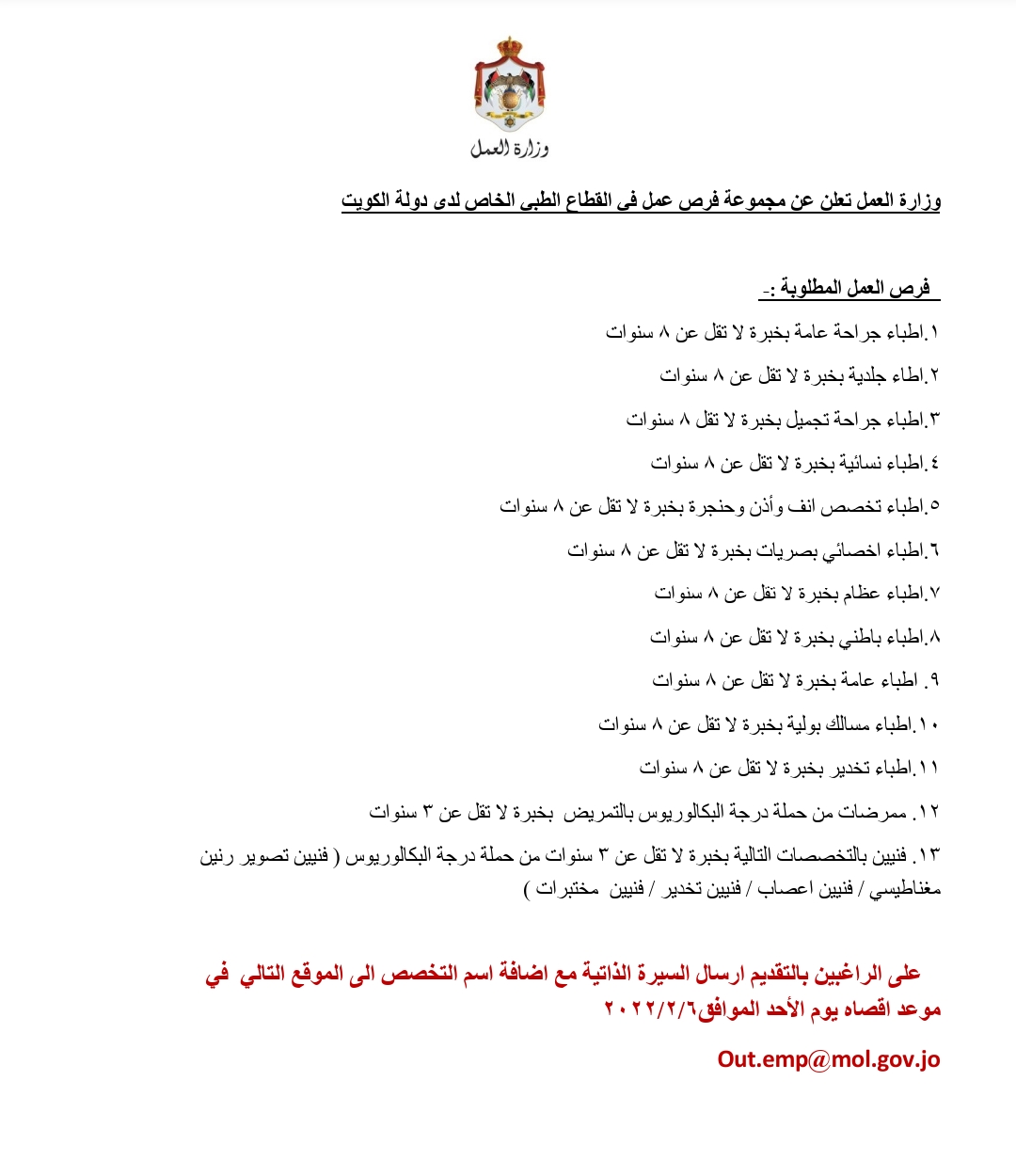 و بإمكان الراغبين بالعمل بهذه التخصصات والمهن إرسال سيرهم الذاتية على عنوان البريد الإلكتروني التالي: Out.Emp@mol.gov.jo.