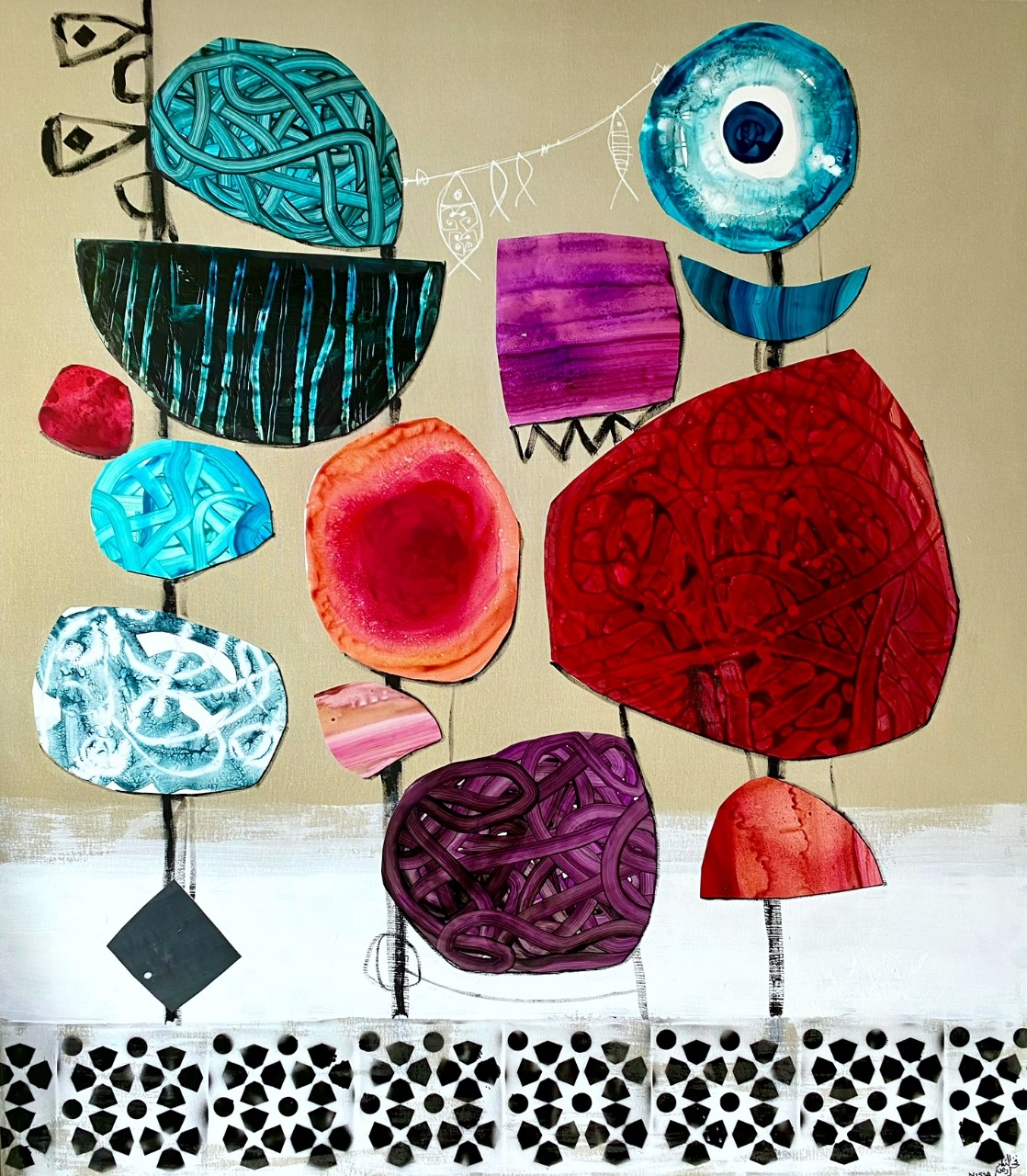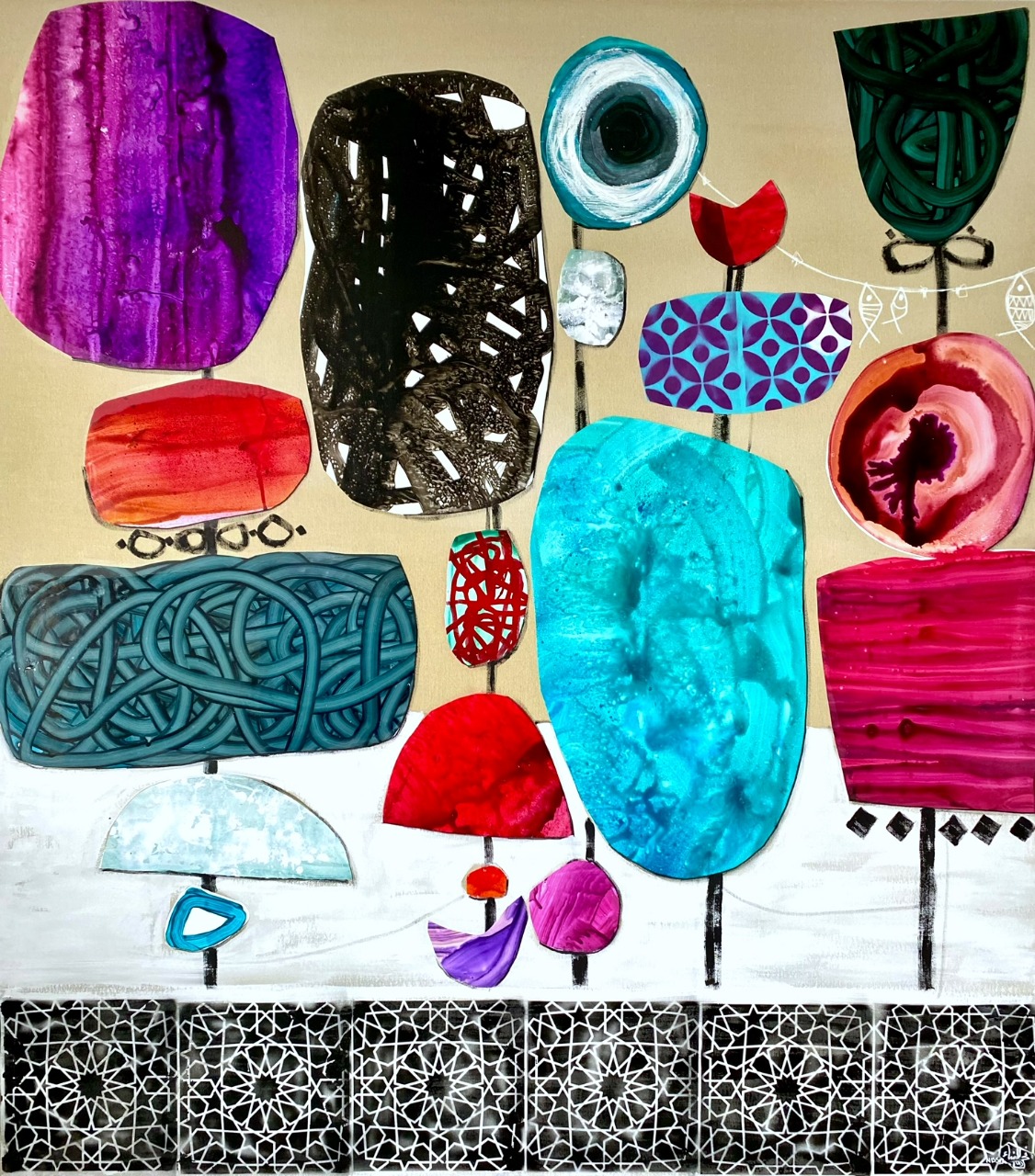 تظهر أعماله الحروف في شكل مجرد ، تنمو وتلتف. تزين الأشكال الهندسية وظلال الأشكال قماشه الذي يتحد مع تدفق الألوان اللطيف والقوي.