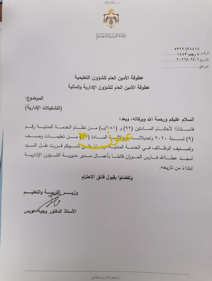 عمون - قرر وزير التربية والتعليم الدكتور وجيه عويس نقل امجد العوران قائما بأعمال مدير مديرية الشؤون الادارية. |