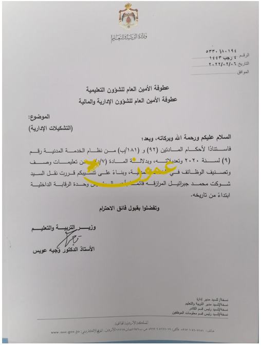 العوران مديرا للشؤون الإدارية والمرازقة رئيسا للرقابة الداخلية في التربية06-02-2022 05:31 PM