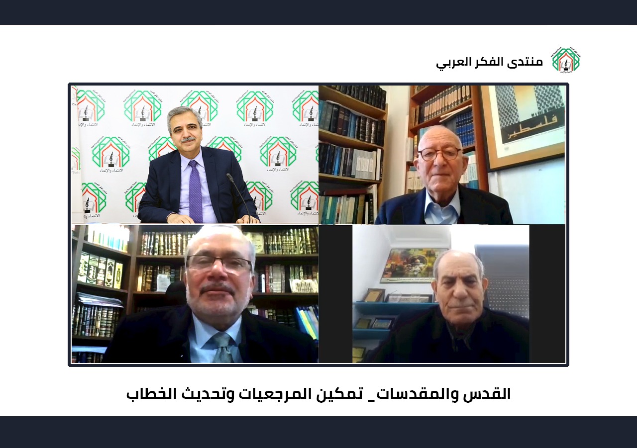 عمون - عقد منتدى الفكر العربي يوم الأربعاء 2/2/2022 لقاءً حوارياً عبر تقنية الاتصال المرئي، حاضر فيه رئيس الجمعية الفلسطينية الأكاديمية للشؤون الدولية وعضو المنتدى د.مهدي عبد الهادي حول "القدس والمقدسات: تمكين المرجعيات وتحديث الخطاب 1917-1967"، وشارك بالمداخلات، في هذا اللقاء الذي أداره الوزير الأسبق والأمين العام للمنتدى د.محمد أبو حمّور، كل من: وزير الأوقاف والشؤون والمقدسات الإسلامية الأسبق د.هايل الداوود، وأمين عام اللجنة الملكية لشؤون القدس الأستاذ عبد الله كنعان.