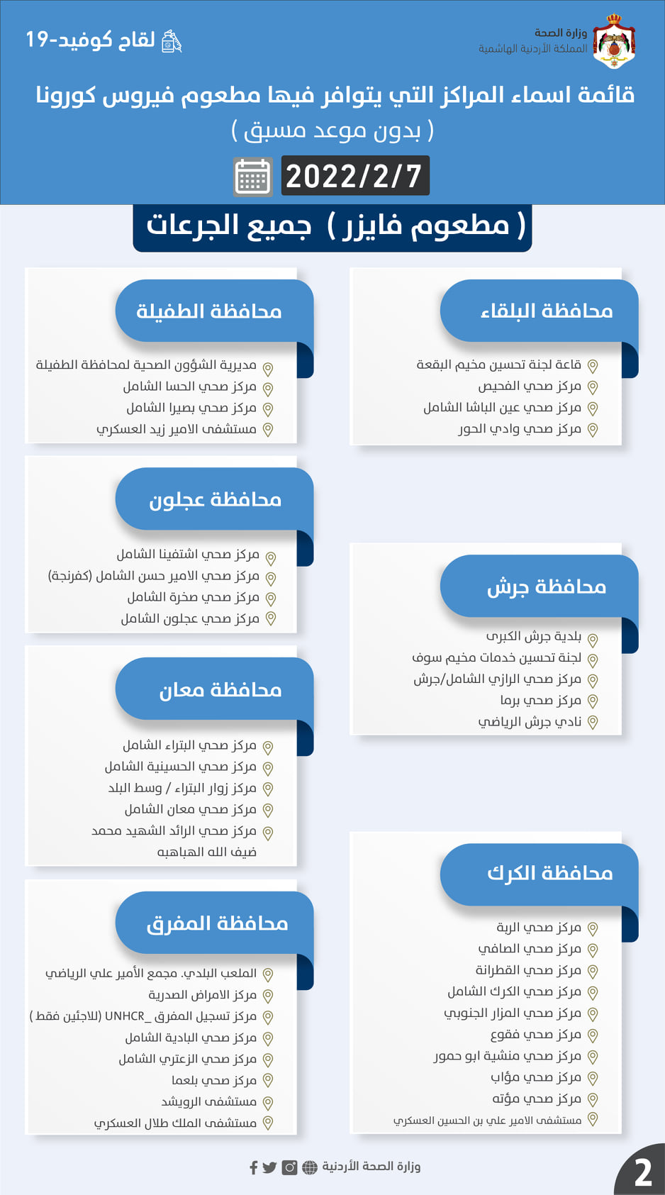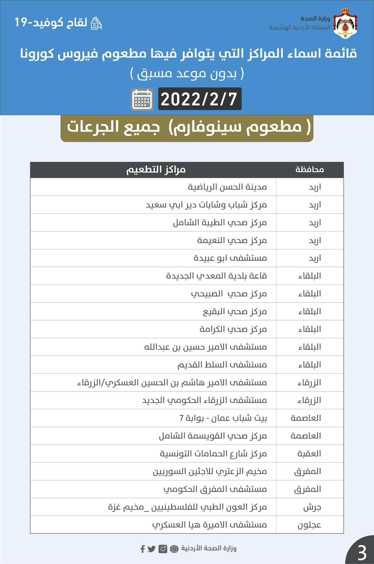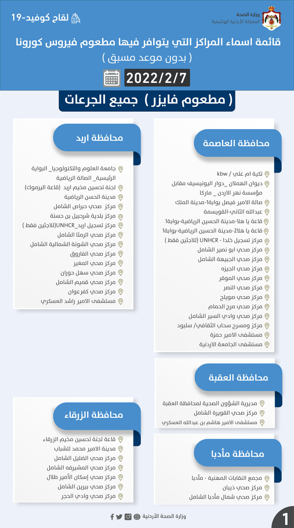 عمون - أعلنت وزارة الصحة مراكز اعطاء لقاح كورونا في الأردن الاثنين.