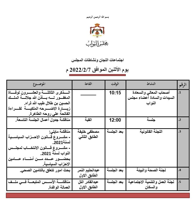 عمون - يعقد مجلس النواب جلسة تشريعية ظهر اليوم الاثنين، لمناقشة قرارات اللجنة المالية النيابية حول مشروعي قانوني الموازنة العامة والوحدات الحكومية لعام 2022.