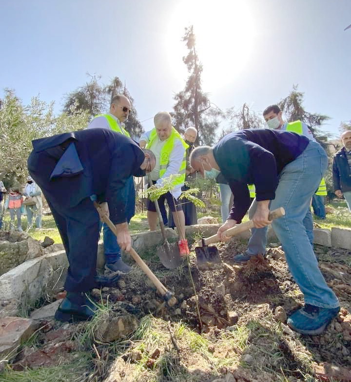عمون - بمناسبة الاحتفال بذكرى مئوية وتأسيس الدولة الأردنية وعيد ميلاد جلالة الملك عبدالله الثاني ابن الحسين حفظه الله تعالى رعى وزير الزراعة الأسبق الدكتور تيسير الصمادي فعالية اطلاق مبادرة جمعية أهل الراية بالتعاون مع مبادرة (اغرسها) بادر لتنمية القدرات (غير ربحية) لزراعة ساحات مدرسة تيسير ظبيان في منطقة أم أذينة بالأشجار المختلفة لتصبح حديقة نموذجية.