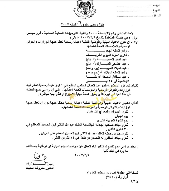 عمون - علمت عمون أن لا قرار سيصدر بتعطيل الوزارات والمؤسسات الحكومية في ذكرى الاسراء والمعراج، والتي تصادف الاثنين المقبل. |