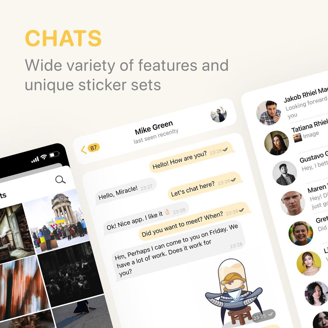 كما يمكن مشاركة ملف تعريف المستخدم الخاص بك كرمز QR ، إذا قمت بإعداد اسم المستخدم الخاص بك، ويتيح التطبيق ترجمة الرسائل من أي لغة إلى اللغة الأم، و يمكن إرسال ملصقات متحركة رائعة مع الاصدقاء، ويتيح تعيين كلمة مرور للتطبيق.