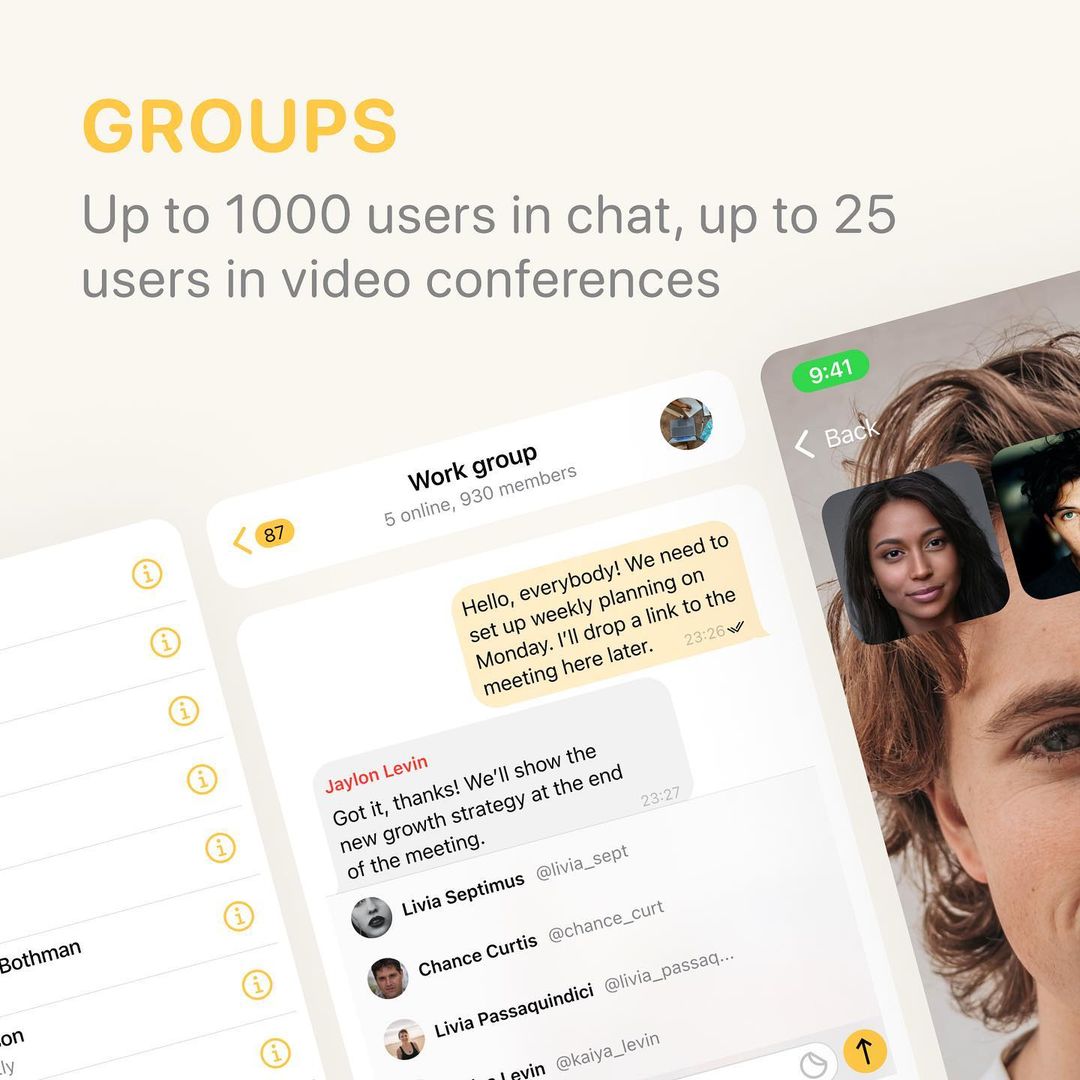 ويوفر التطبيق خدمات رسائل فورية بأعلى سرعة لنقل الملفات ومجموعة متنوعة من الميزات، مكالمات صوت وفيديو مجانية، دعم المجموعات في التطبيق ما يصل إلى 1000 مستخدم.