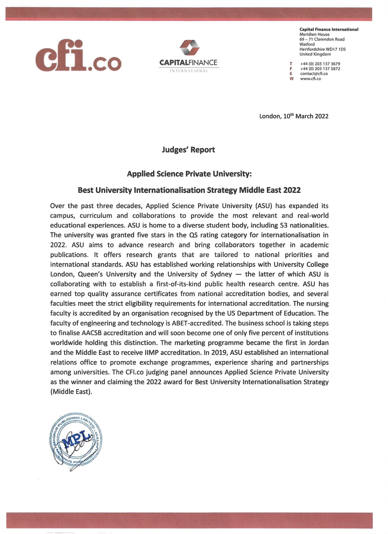 عمون - حصلت جامعة العلوم التطبيقية الخاصة على جائزة أفضل جامعة في استراتيجيتها نحو العالمية على مستوى الشرق الأوسط من Capital Finance International - cfi.co البريطانية، وذلك نتيجة لمسيرتها المتميزة للحصول على الاعتمادات الدولية وخططها المدروسة لدخول أهم التصنيفات العالمية وتميزها في ذلك خلال فترة زمنية وجيزة. |