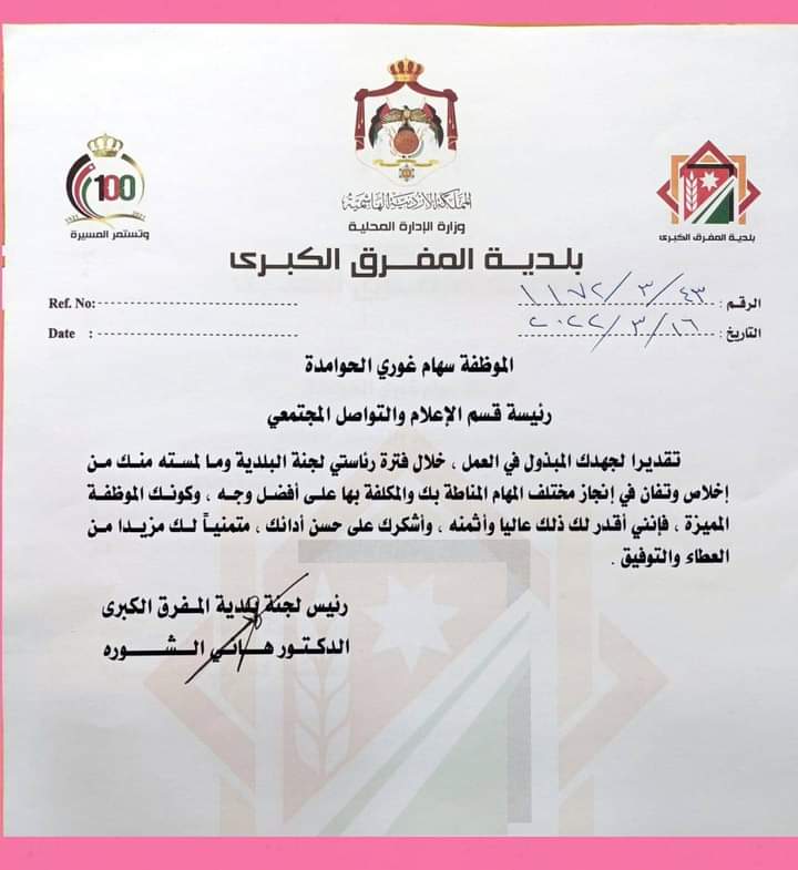 عمون - كرم نائب محافظ المفرق ومتصرف لواء قصبة المفرق ورئيس لجنة بلدية المفرق الكبرى الدكتور هاني الشورة، الزميلة سهام غوري الحوامدة رئيسة قسم الإعلام والتواصل المجتمعي في بلدية المفرق الكبرى بشهادة تميز لادائها في عملها الإعلامي والتواصل المجتمعي. |