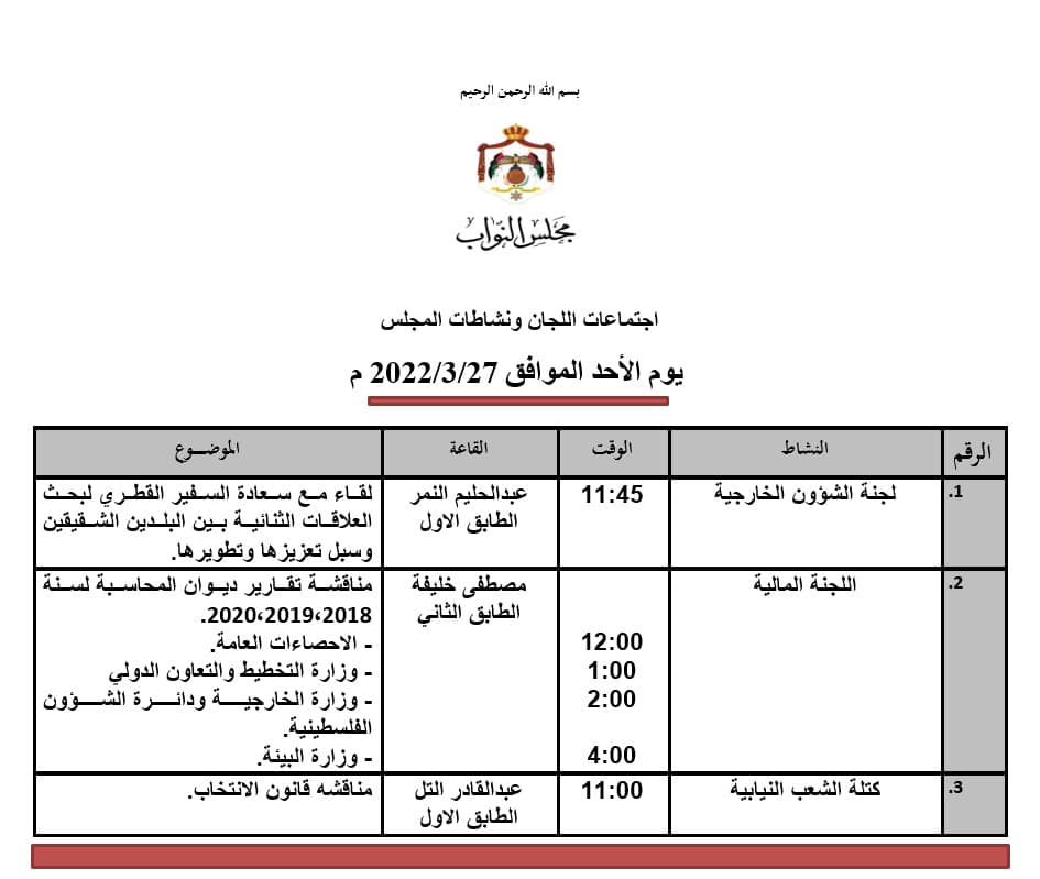 عمون - تجتمع لجان نيابية مختصة في مجلس النواب اليوم الأحد، لمناقشة عدة قضايا، حيث تواصل اللجنة المالية النيابية مناقشة تقارير ديوان المحاسبة لسنة 2018،2019،2020 لكل من؛ وزارة البيئة، وزارة الخارجية ودائرة الشؤون الفلسطينية، وزارة التخطيط والتعاون الدولي، ودائرة الإحصاءات العامة. |