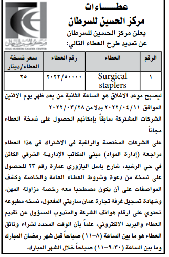 عطاء صادر عن مركز الحسين للسرطان