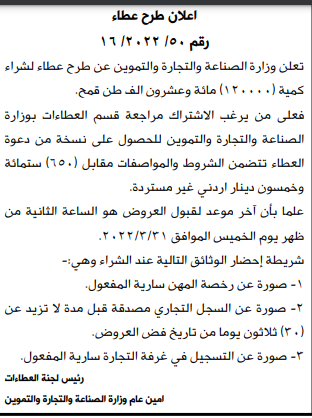 مطلوب شراء "120"الف طن قمح