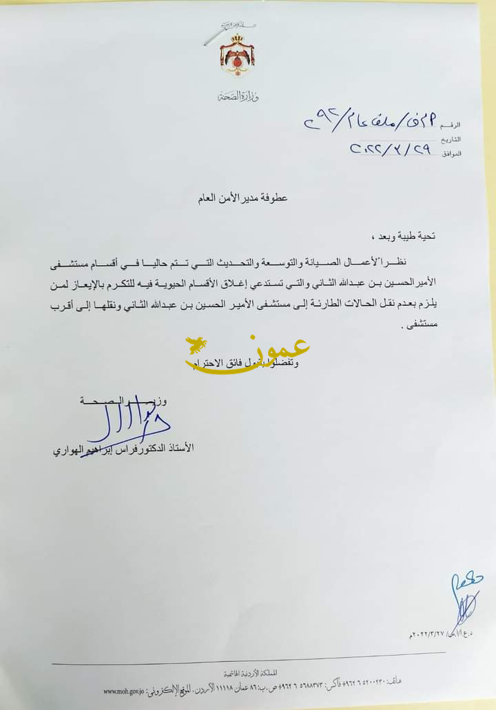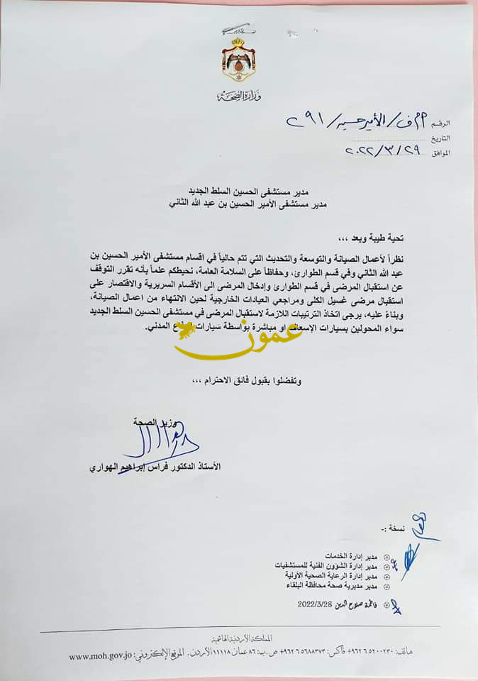 وأبقى القرار الذي وصل "عمون" نسخة عنه، على استقبال مرضى غسيل الكلى ومراجعي العيادات الخارجية لحين الانتهاء من اعمال الصيانة، فيما يمنع
