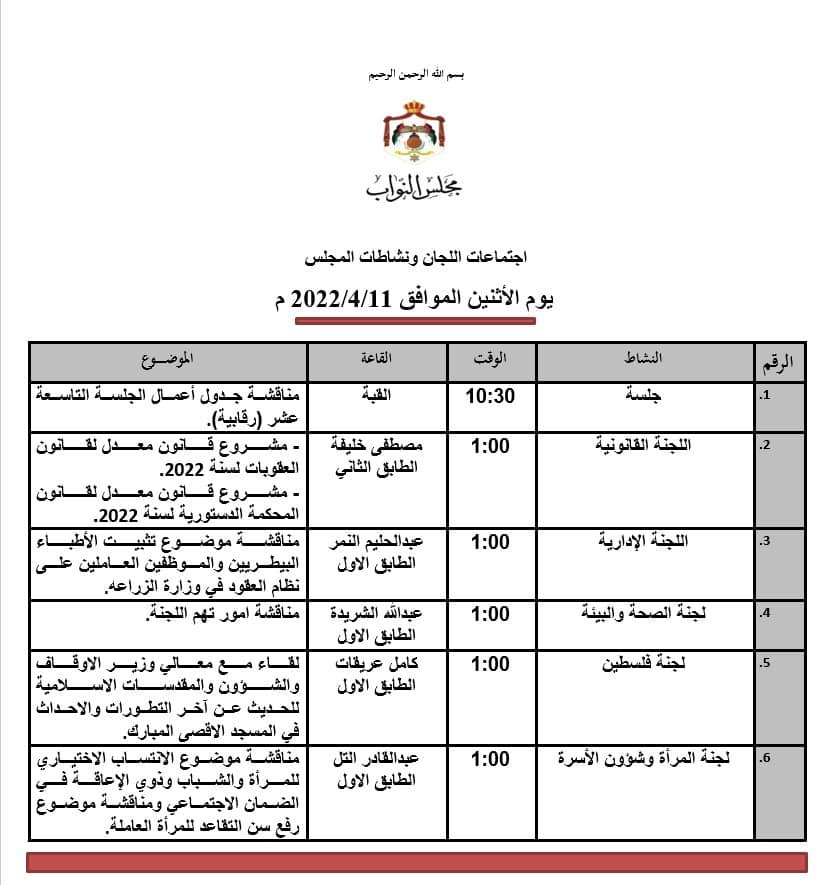 وتعقد اللجنة القانونية في المجلس اجتماعا تُناقش فيه مشروع قانون معدل لقانون العقوبات، ومشروع قانون معدل لقانون المحكمة الدستورية، وتناقش اللجنة الإدارية موضوع تثبيت الأطباء البيطريين والموظفين العاملين على نظام العقود في وزارة الزراعة.