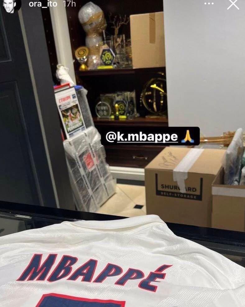 وشكر الفنان أوروا إيتو، كيليان مبابي على هدية عبارة عن قميص يحمل توقيعه، لكن خلف القميص ظهرت صناديق من ورق مقوى مغلفة وأشياء تخص اللاعب أيضا مغلفة، ومنها كأس كوبا لأفضل لاعب شاب فاز به، العام 2018، وهو أيضا مغلف ويظهر كأن النجم الفرنسي يستعد لتغيير منزله.