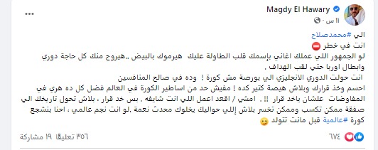 وكتب الهواري في منشور على حسابه في فيسبوك: "إلى محمد صلاح أنت في خطر.. لو الجمهور اللي عملك أغاني باسمك قلب الطاولة عليك هيرموك بالبيض.. هيروح منك كل حاجه دوري وأبطال أوروبا حتى لقب الهداف".