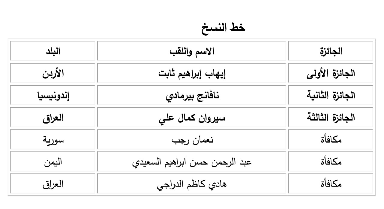 ووُزّعت الجوائز من الدرجة الأولى والثانية والثالثة وكذلك مكافآتٌ في كل نوعٍ من أنواع الخطّ.