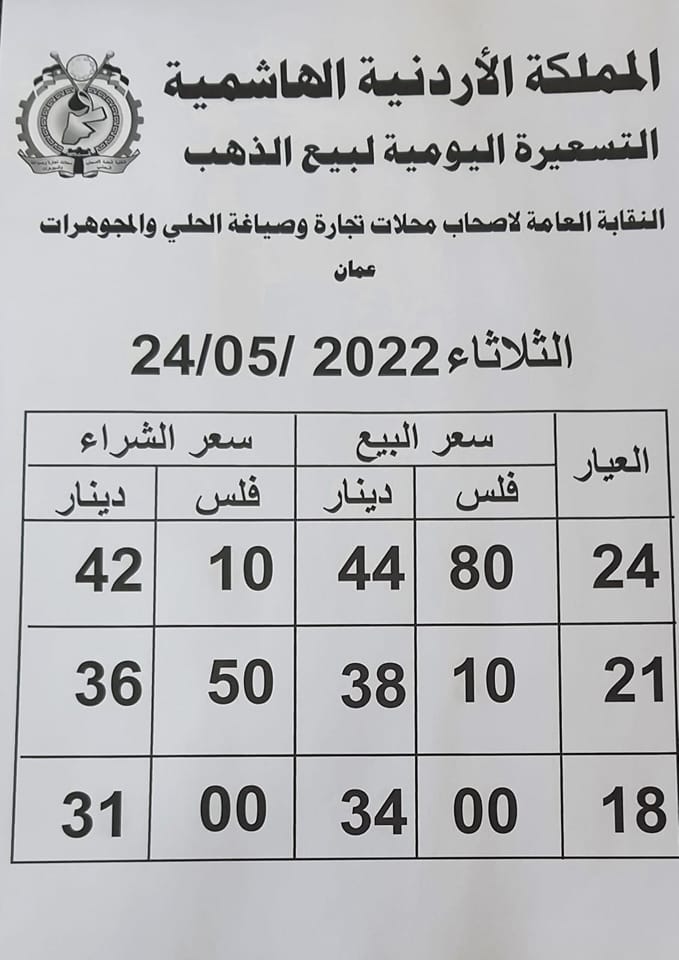 اسعار الذهب في الأردن الثلاثاء24-05-2022 11:43 AM