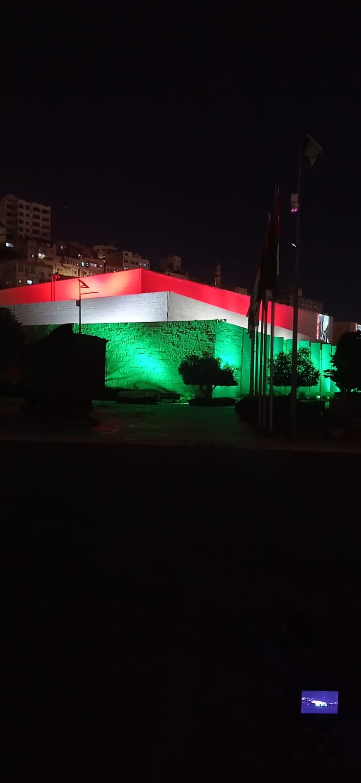 عمون - أضاء متحف الأردن مساء الأربعاء، مبناه بألوان العلم الأردني، احتفالاً بعيد إستقلال المملكة السادس والسبعين.